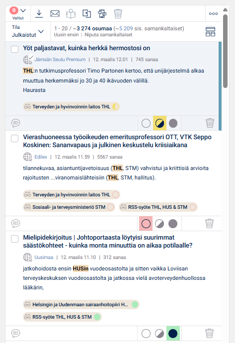 Voit halutessasi sävyttää artikkeleita portaalissa manuaalisesti. Huomioithan, että pystyäksesi analysoimaan näitä osumia järkevästi, on sävytystä hyvä tehdä pitemmällä aikavälillä ja säännöllisesti.