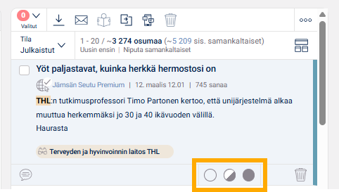 4. Jokaisen osuman alla näet kolme ympyrää. Nämä indikoivat osuman sävyn. Vasen on negatiivinen, keskimmäinen neutraali, oikeanpuoleinen positiivinen: