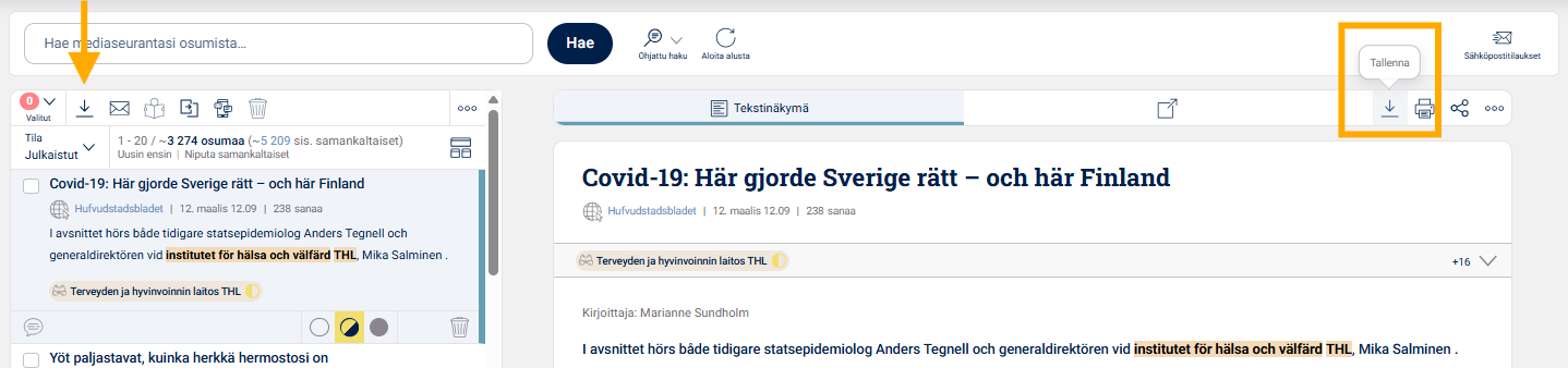 Voit tallentaa osuman klikkaamalla sen otsikkoa ja valitsemalla sitten osuman oikealle puolella aukeavan esikatselun yläreunasta . Voit myös tallentaa useamman osuman valitsemalla ne jokaisen osuman vasemmasta yläkulmasta ja klikkaamalla sen jälkeen yläreunasta tallennuskuvaketta, jolloin sinulle aukeaa uusi ikkuna, jossa voit valita, missä muodossa haluat tallentaa raportin.