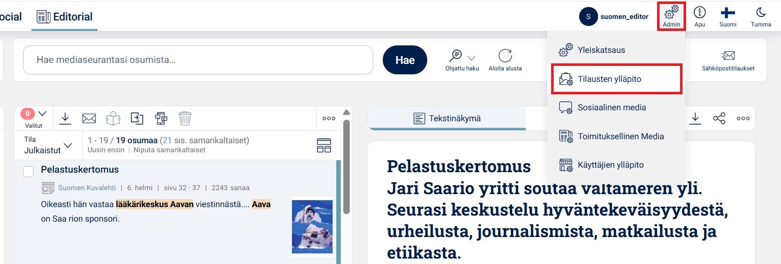 Monitor Manage -näkymässä ollessasi, klikkaa portaalin oikeasta yläkulmasta Admin-kuvaketta tai valitse sen jälkeen Tilausten ylläpito.