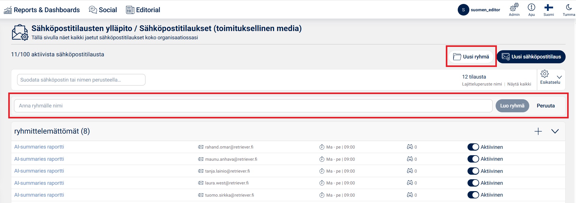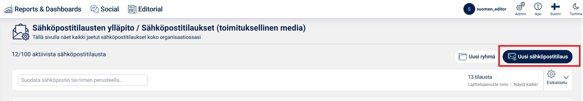 Avautuvasivulla pääset hallinnoimaan sekä toimituksellisen (Editorial) että sosiaalisen (Social) median sähköpostitilauksia, sekä myös Tilauslomakkeita.