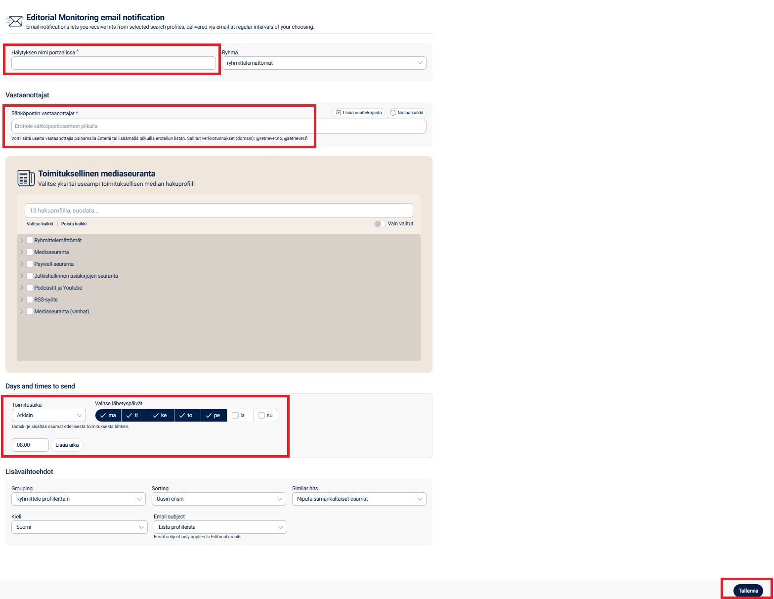 toimituksellisen median profiilit, joista voit liittää vastaanottajan/-ien raportille haluamasi toimitettavaksi haluttuna ajankohtana.
