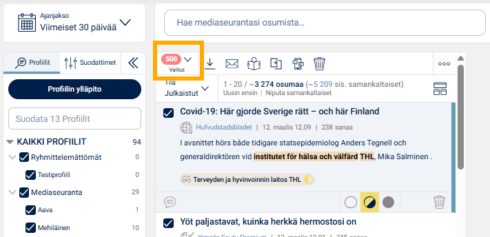 Voit valita Retrieverin portaalista kerralla maksimissaan 500 osumaa tallennettavaksi Tallenna-työkalun avulla.