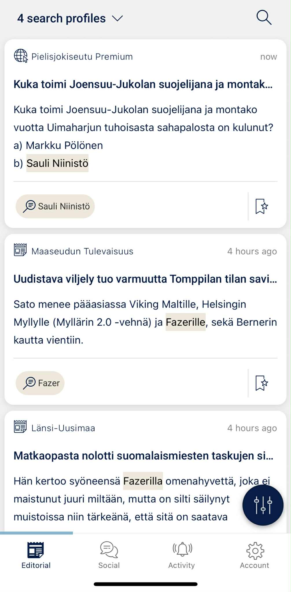 Oikean alakulman tummansinisen kuvakkeen alta pääset rajaamaan hakumääreitäsi. Nämä toimivat samalla tavalla niin toimituksellisen kuin sosiaalisenkin median osioissa.