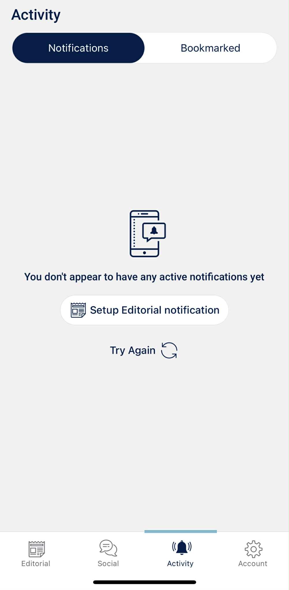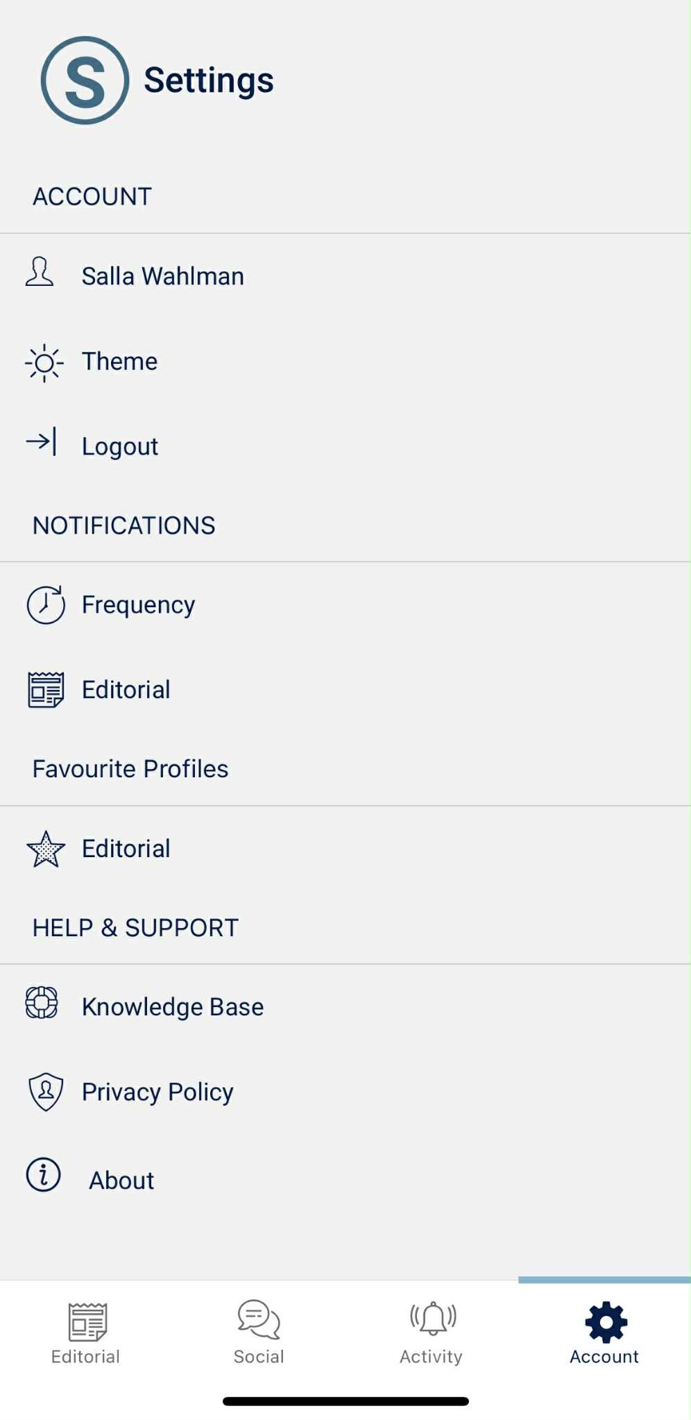 Sivun alareunasta löydät valikot, joiden avulla navigoida. Aloitussivu on aina toimituksellisen median sivusto (jos se kuuluu organisaationne sopimukseen), sen vieressä on kuvake sosiaalisen median seurannalle (tämäkin sopimuskohtaista), aktiviteeteille sekä tilin asetuksille.