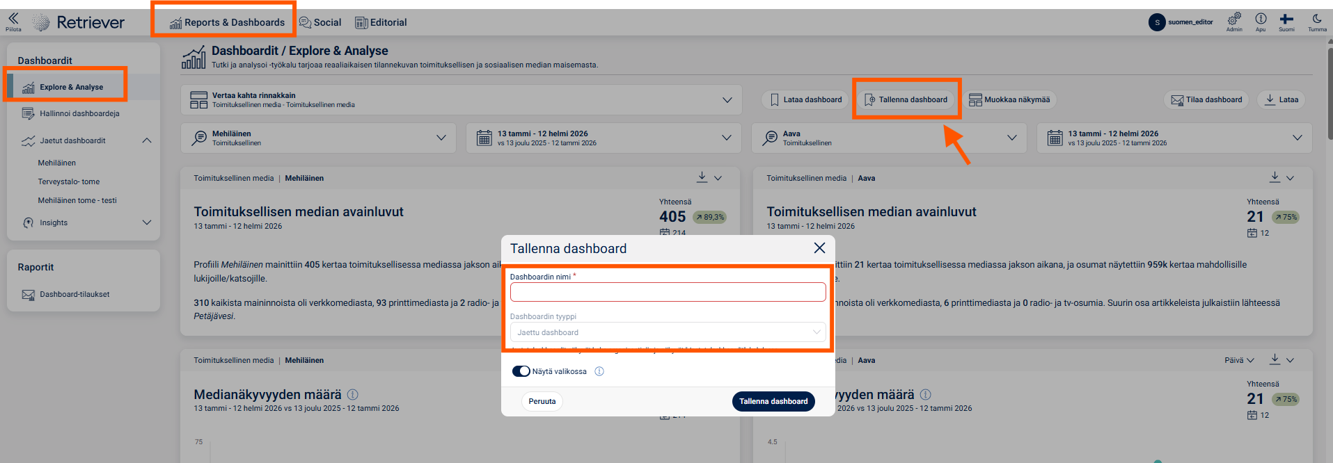 Käyttäjätasosi määrittelee, onko sinun mahdollista tallentaa tai tilata dashboard-näkymääsi. Jos sinulta puuttuvat oikeudet tai olet epävarma käyttäjätasostasi, ole yhteydessä asiakaspalvelutiimiimme osoitteessa info@retriever.fi