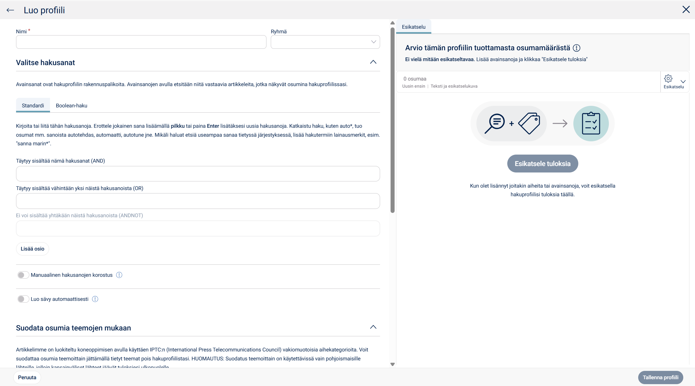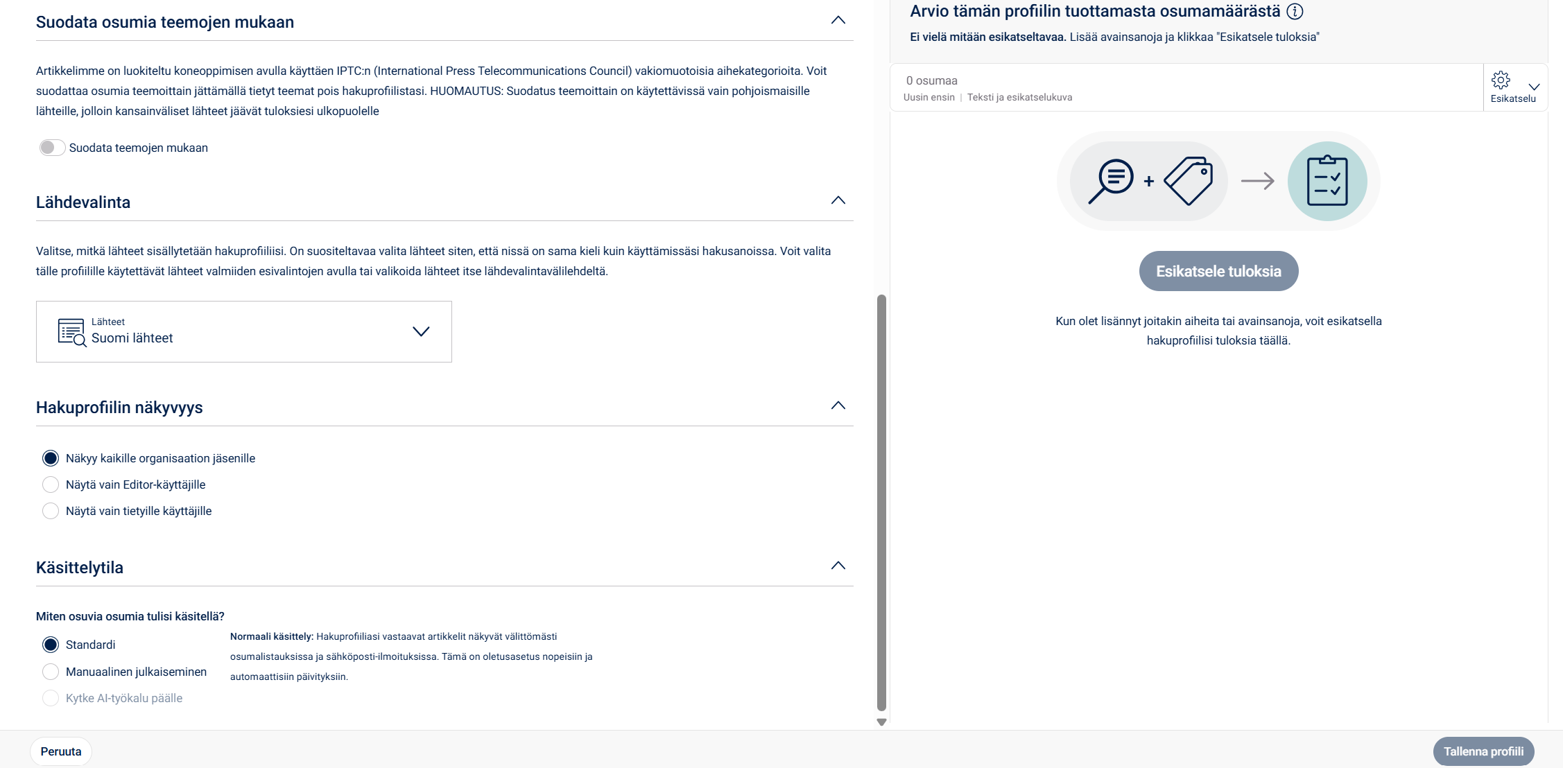 Voit suodattaa hakuprofiilia IPTC-teemojen (International Press Telecommunications Council) perusteella sekä rajaamaan lähdevalikoimaa tarpeittesi mukaan. Halutessasi voit myös rajata sitä, kenelle tämä kyseinen hakuprofiili näkyy.