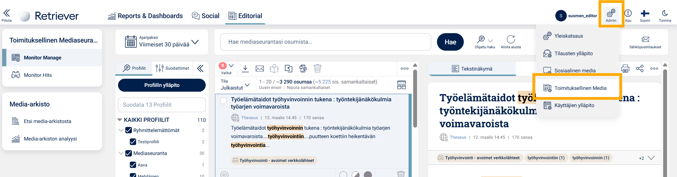 Luodaksesi oman hakuprofiilin, valitse Admin-kuvakkeen alta Toimituksellinen Media Monitorin Manage-näkymässä (tarvitset tätä varten editor-tason tunnukset).