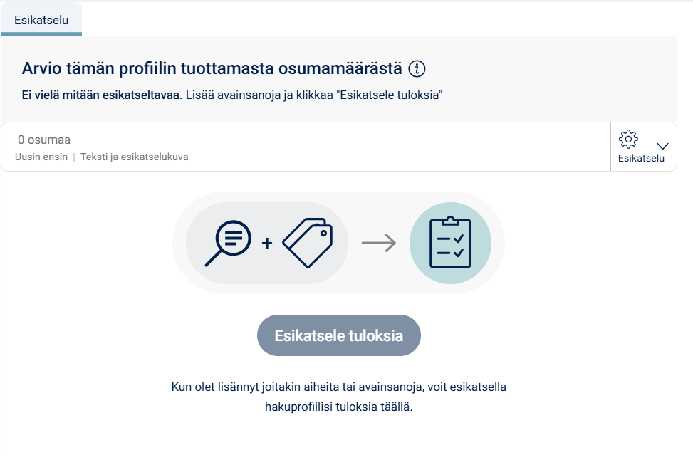 Kun hakulausekkeesi vaikuttaa valmiilta, voit ennen tallentamista klikata oikealta Esikatsele tuloksia, jolloin näet jo nopeasti, millaisia tuloksia hakusi voisi tuoda. Tämän jälkeen voit vielä halutessasi muokata hakua tarpeittesi mukaan (rajata hakua, lisätä tai poistaa hakusanoja tms.) ja esikatsella uudestaan.