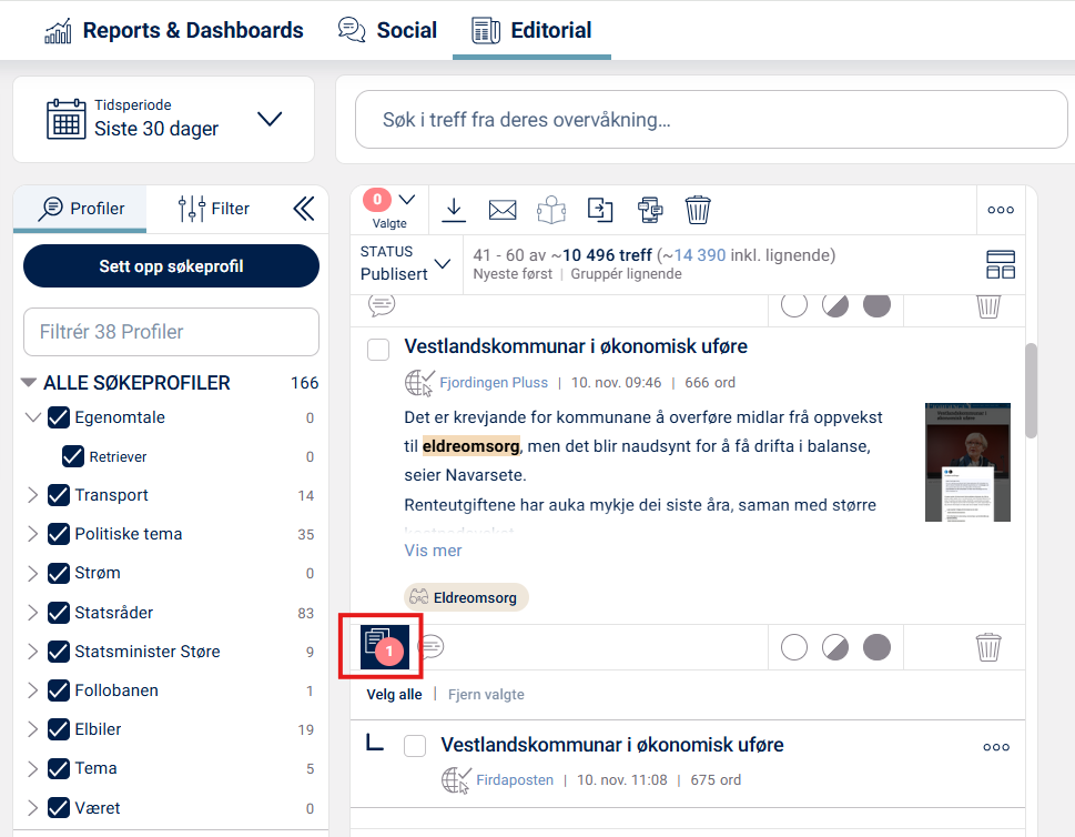 Når filteret fanger opp like treff, vil de skjules under den første av de like artiklene som ble fanget opp. Symbolet under vil da vises under denne første artikkelen, for å vise hvor mange like artikler som finnes.