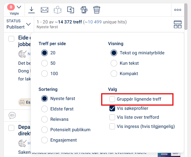 Likhetsfiltret skjuler artikler som er minst 80% like en annen nylig publisert artikkel. Vi benytter filteret for å holde trefflisten i portalen og e-postvarslingen oversiktlig.