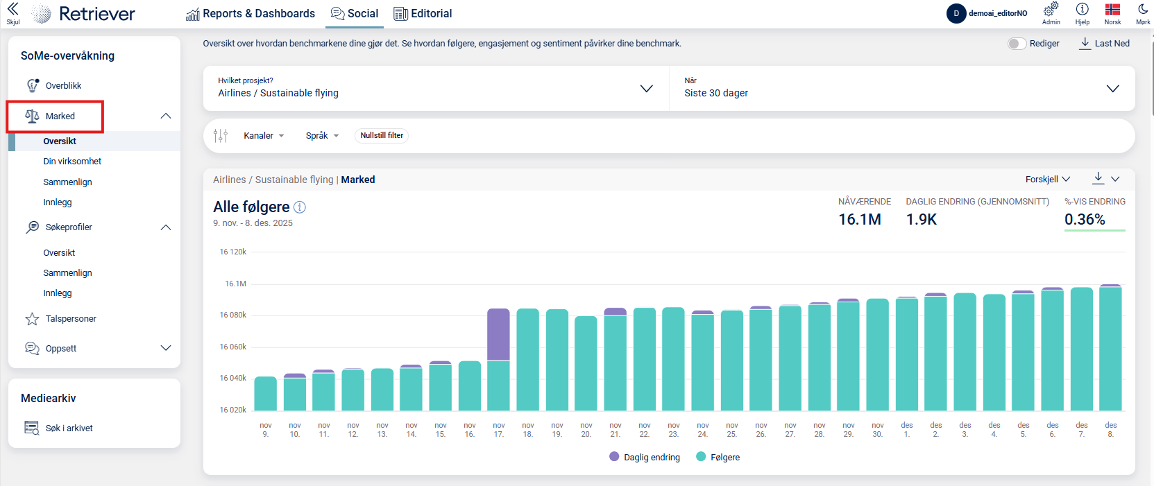 I Marked får du en oppsummert oversikt over alle kontoene i Marked, inkludert deres egne kontoer og Benchmarks.