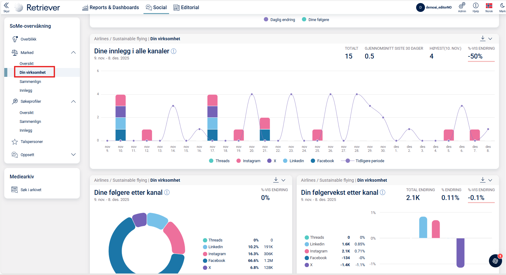 Under Din virksomhet har du muligheten til å ta et dypdykk i statistikken til ditt eget selskap. Her får du oversikt over blant annet: Dine følgere, dine interaksjoner, alle oppfatninger av deg og dine vanligste emneknagger.