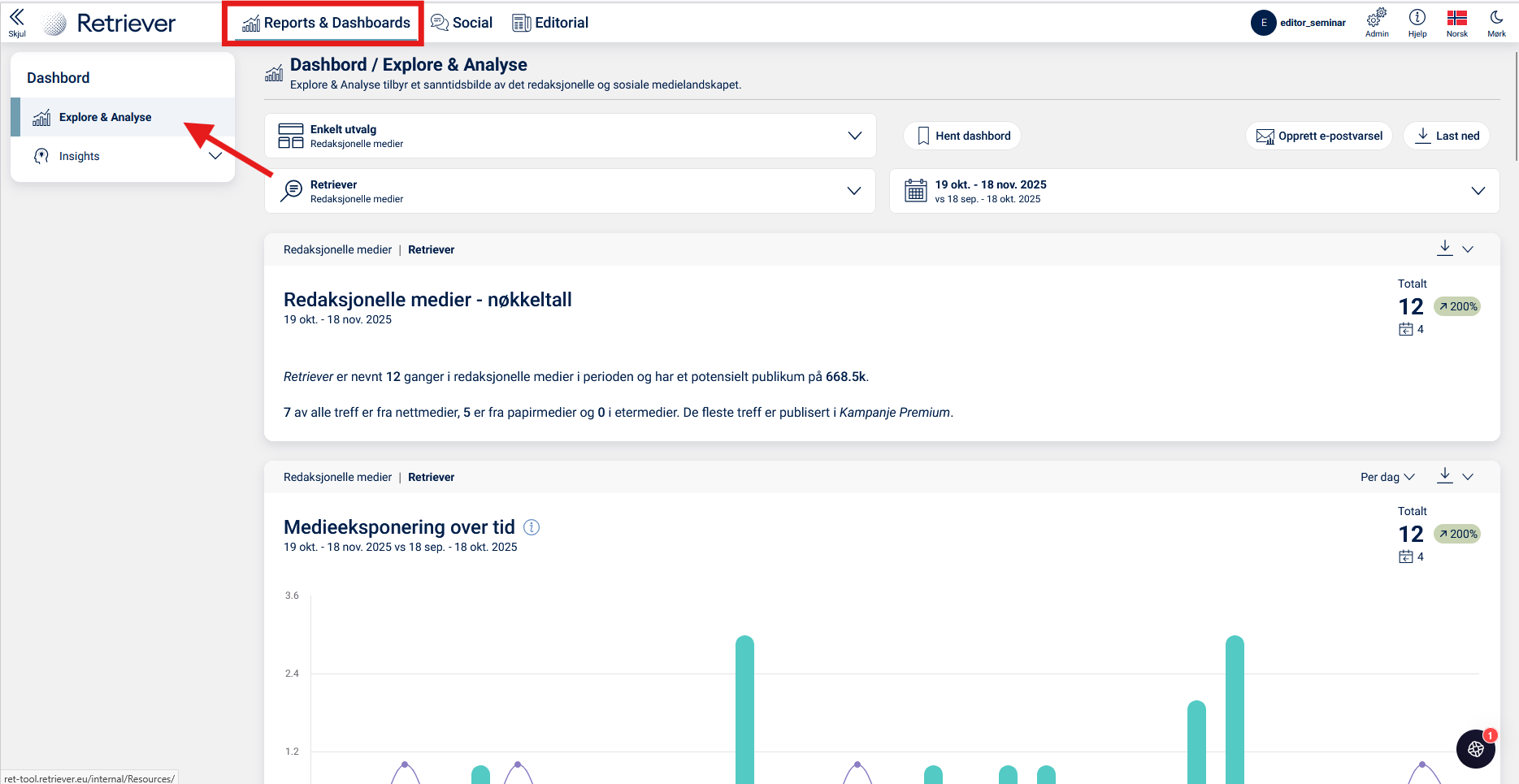 Verktøyet Uforsk & Analysér under "Reports & Dashboards" er et analytisk verktøy hvor du kan generere forskjellige diagrammer med kvantitativ statistikk. Du kan sammenligne din overordnede mediedekning, som er generert av de ulike søkeprofilene og søkeordene, som er satt opp i Monitor (redaksjonelle medier) og Listen (sosiale medier).