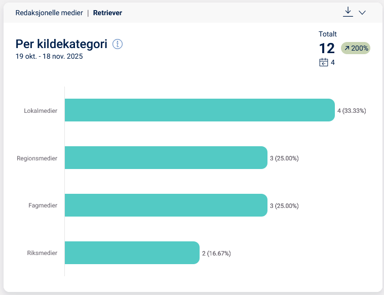 Kildekategori er en detaljert måte å dele inn mediene på etter type for å skape en større forståelse for hvor medieoppslaget har oppstått. Nedenfor ser du et eksempel på hvilke kategorier som finnes og hvordan de kan se ut i Retrievers plattform.