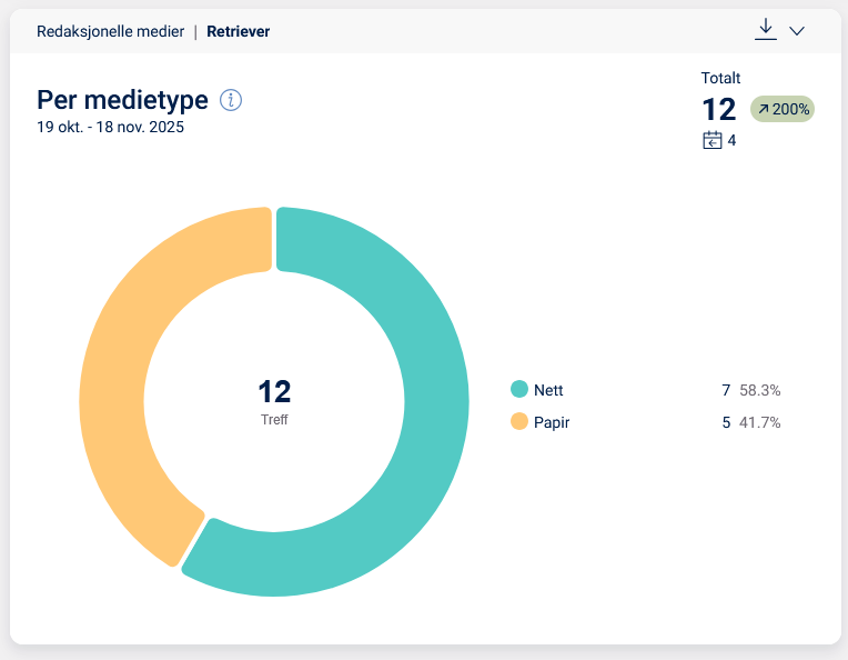 Retriever deler publisitet inn i tre medietyper: web, print og eter. Web omfatter alle nyhetsartikler som publiseres på web, både åpne artikler og de bak betalingsmur. Print omfatter alle trykte artikler og eter inkluderer innslag fra tv, radio og podcast. Nedenfor ser du et eksempel på hvordan det kan se ut i Retrievers plattform.