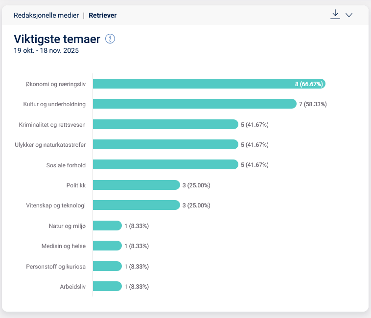 Under Viktigste temaer ser du hvilket tema som dominerer artiklene i søkeprofilen din. Kategoriseringen gjøres automatisk, og bruker nøkkelord i teksten til å avgjøre hvilket tema som er mest sentralt.