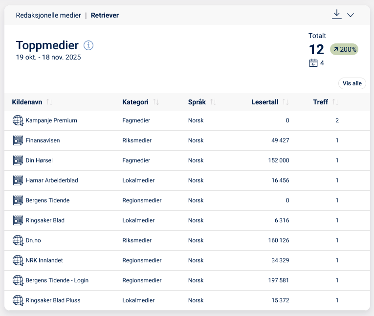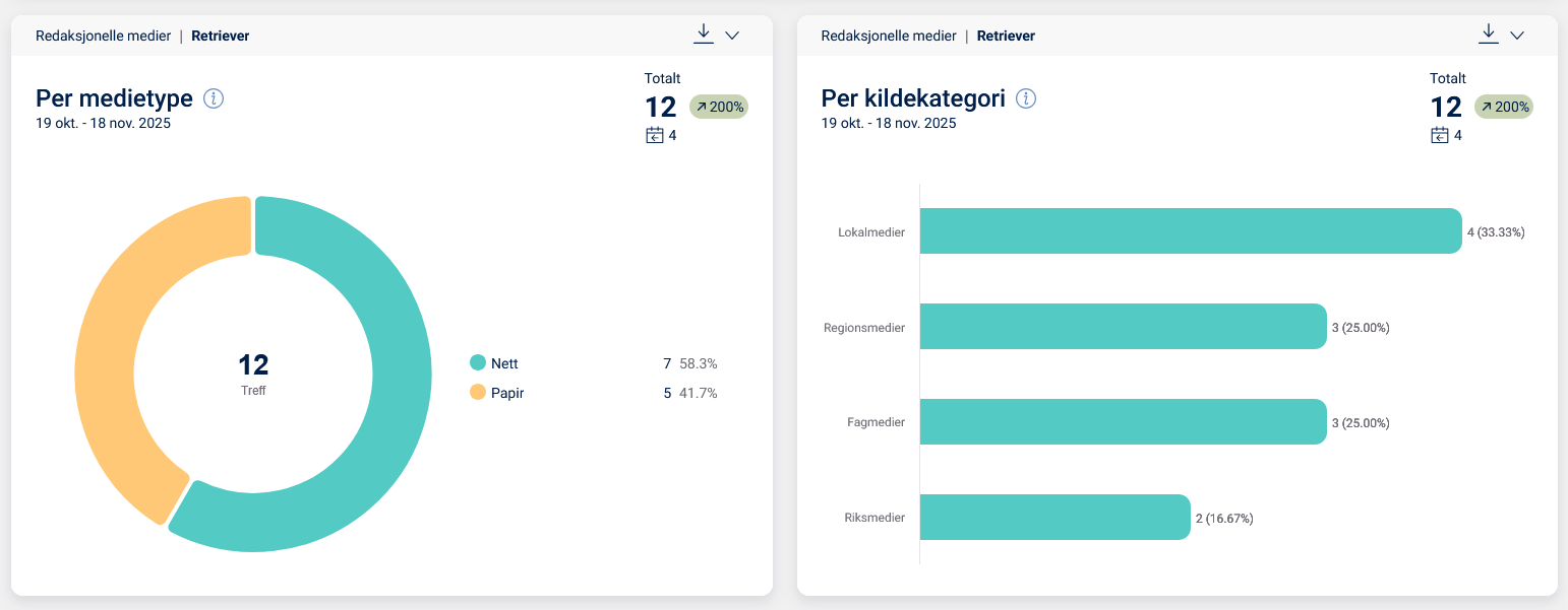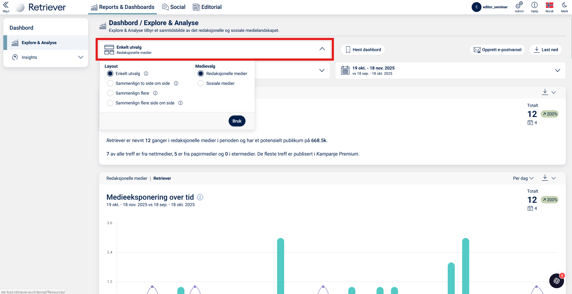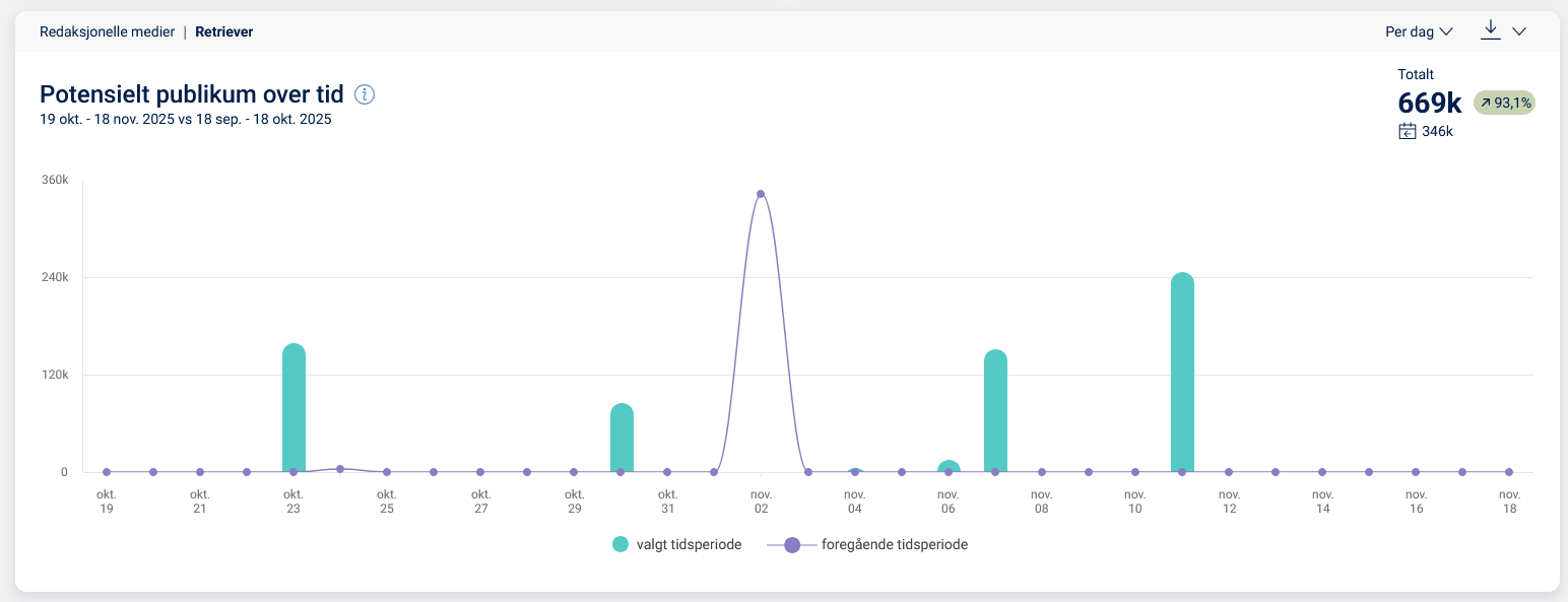 Verktøyet gir deg et overblikk av hvordan mediedekningen fordeles over tid. Du kan også se tallene fra forrige periode.
