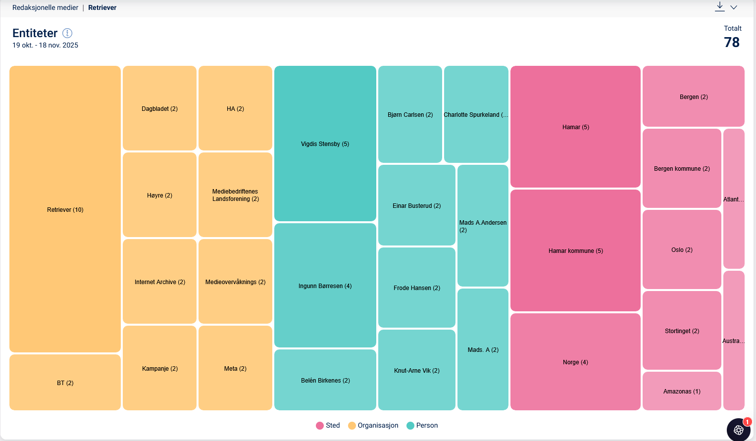 Entiteter viser hvilke egennavn som nevnes i sammenheng med søkeordene i søkeprofilen deres. Entiteter kan være organisasjoner, steder eller personer.