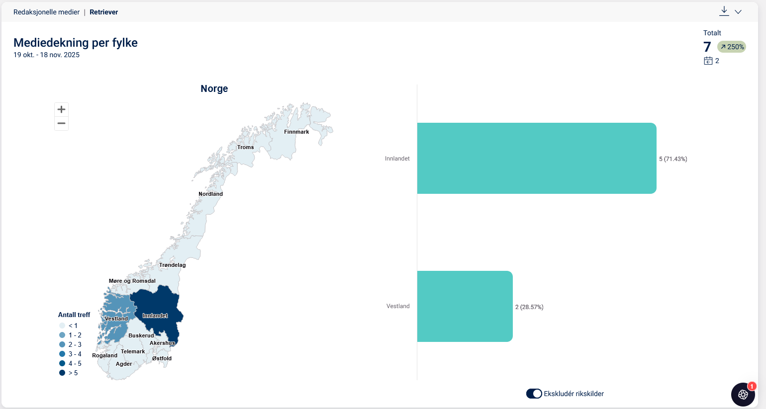 Mediedekning per fylke viser hvordan temaet i søkeprofilen deres fordeler seg utover landet, og hvilket fylke som har skrevet flest artikler om det.