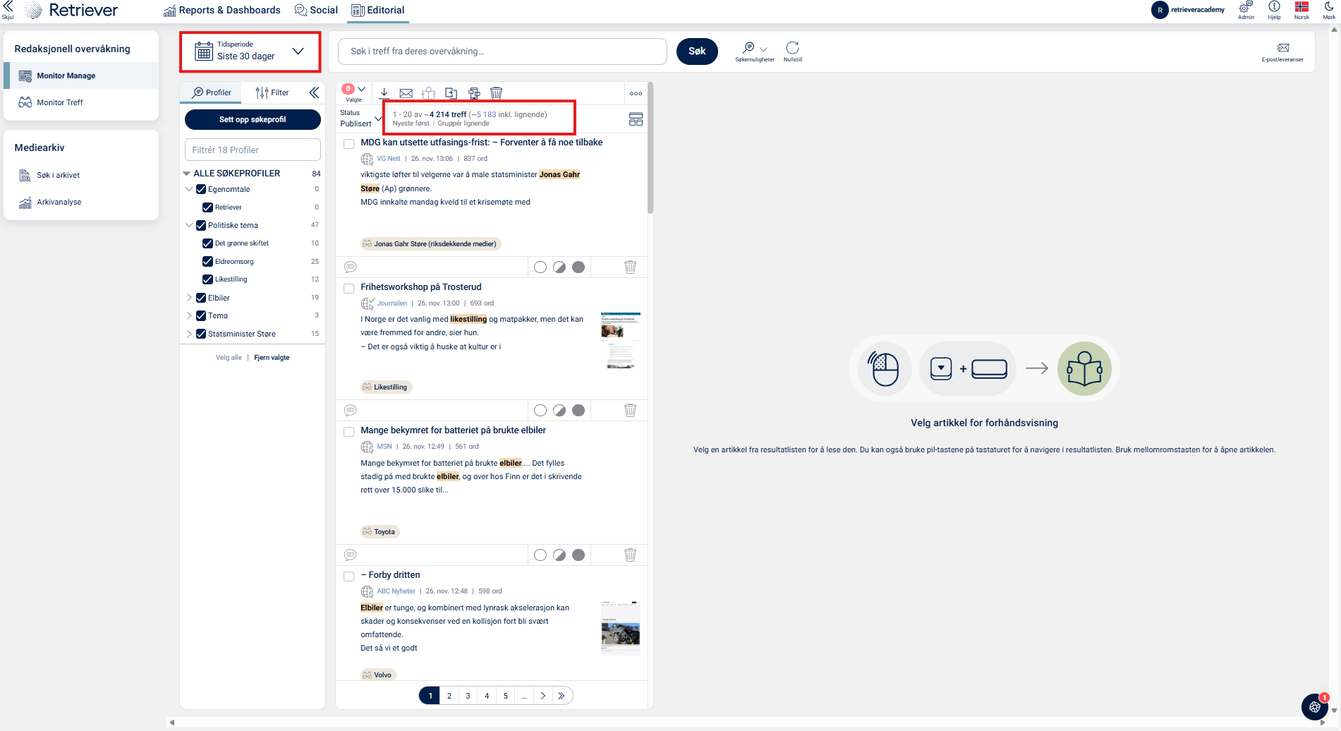 I Monitor kan du til å se alle treff som ligger inne på søkeprofilene deres. Under Tidsperiode øverst til venstre velger du hvilken tidsperiode du ser treff for. Antallet artikler i den gitte tidsperioden vises over artikkellisten.