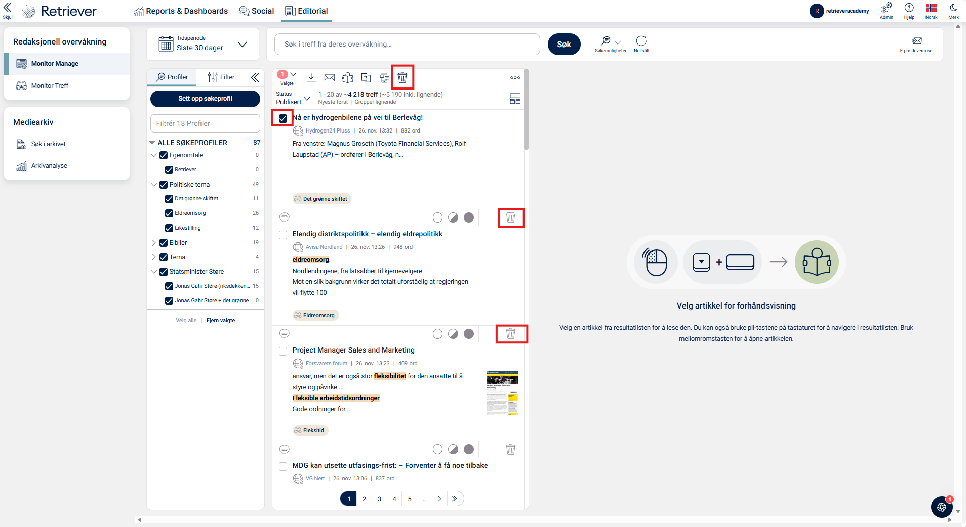 2. Huk av for artikkelen i trefflisten og klikk så på søppelbøtten under. Søppelbøtten finnes også i menylinjen øverst på siden.