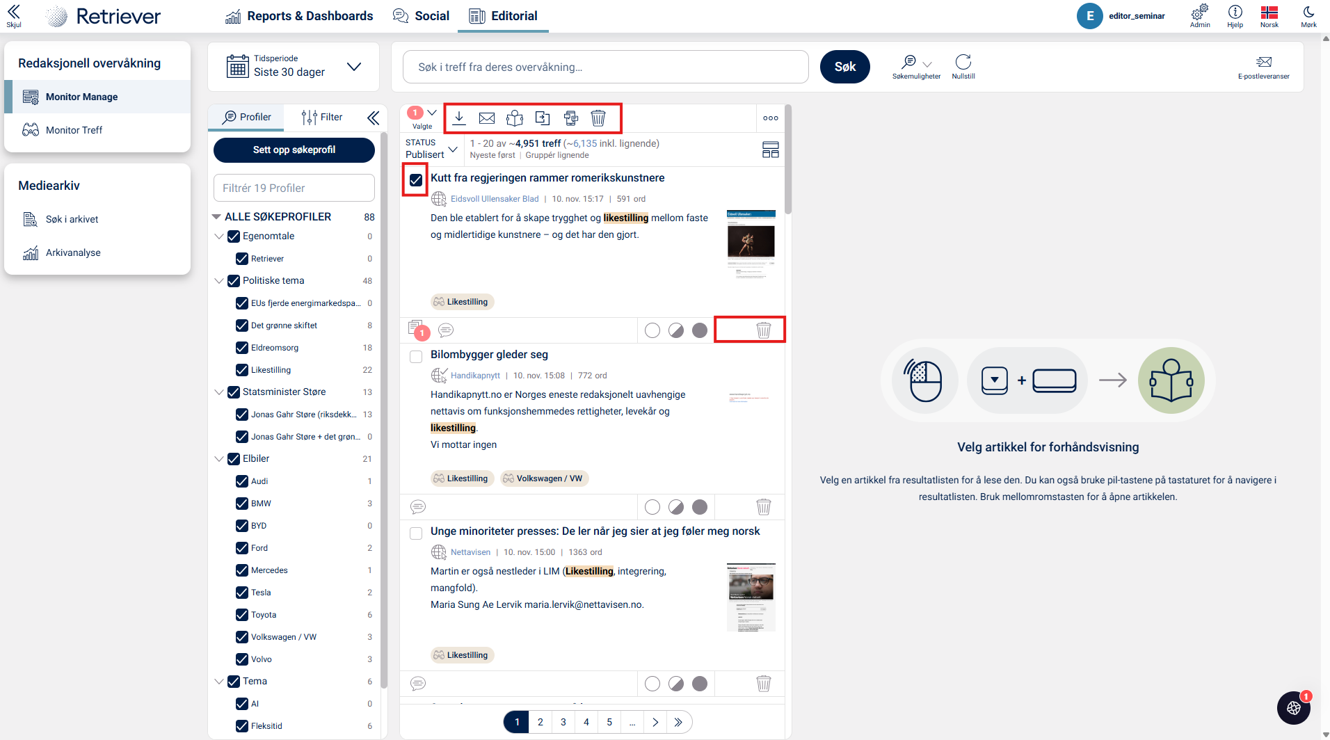 Lagre: Her kan du ta ut artikkelrapporter av dine valgte artikler