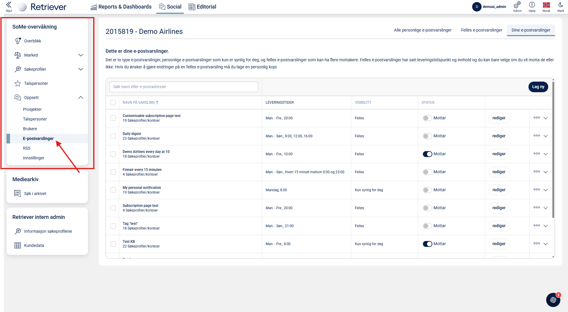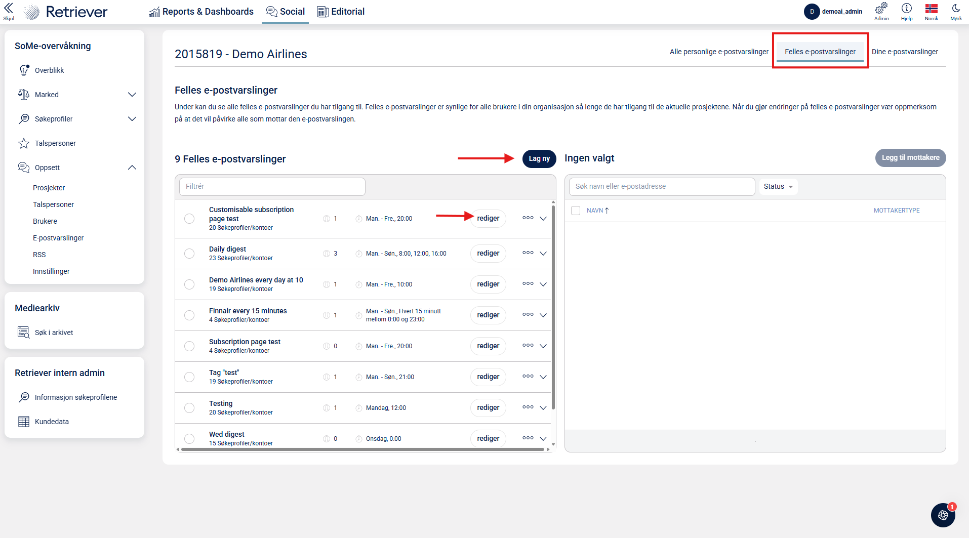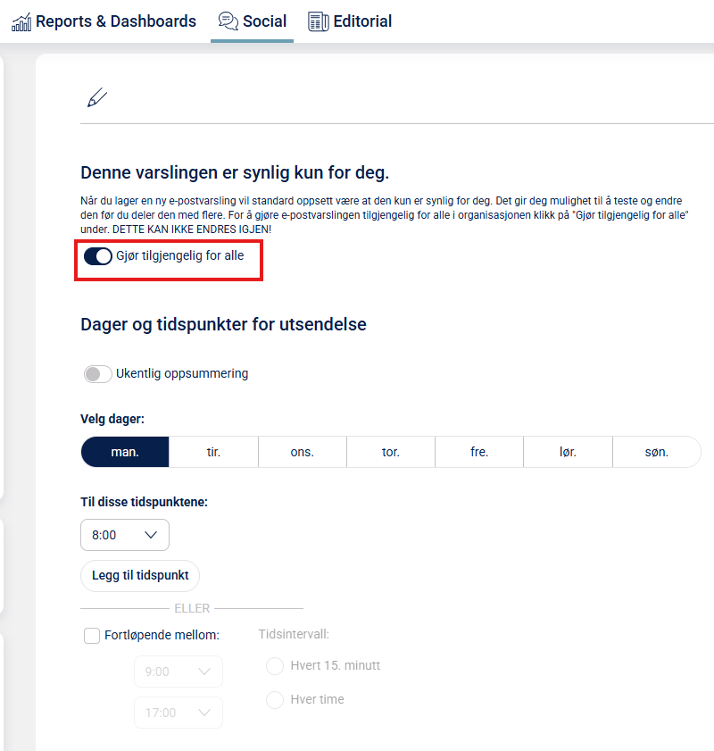 Dersom du har en admin/ editorbruker i Social har du mulighet til å opprette delte e-postvarslinger. Delte e-postvarslinger gjør det mulig for flere brukere/ abonnenter å motta disse e-postvarslingene.