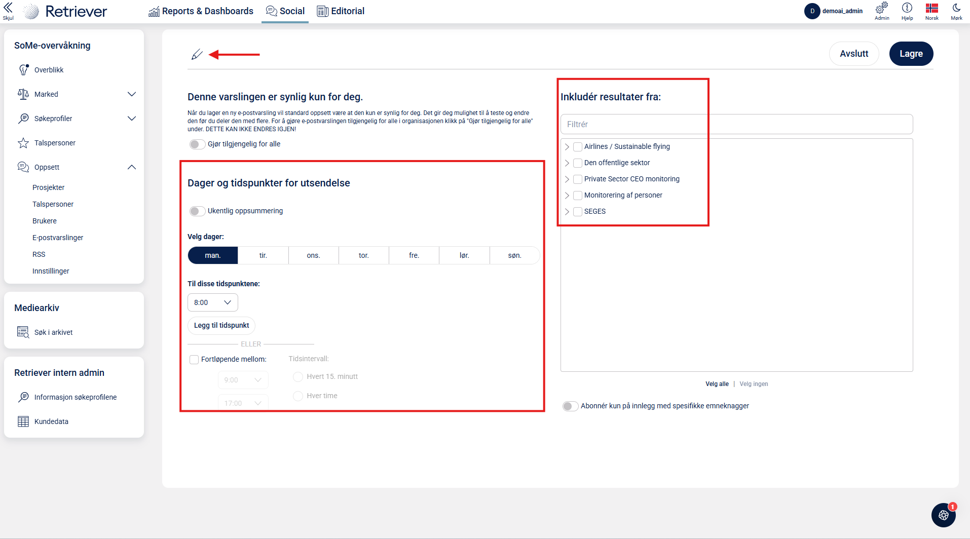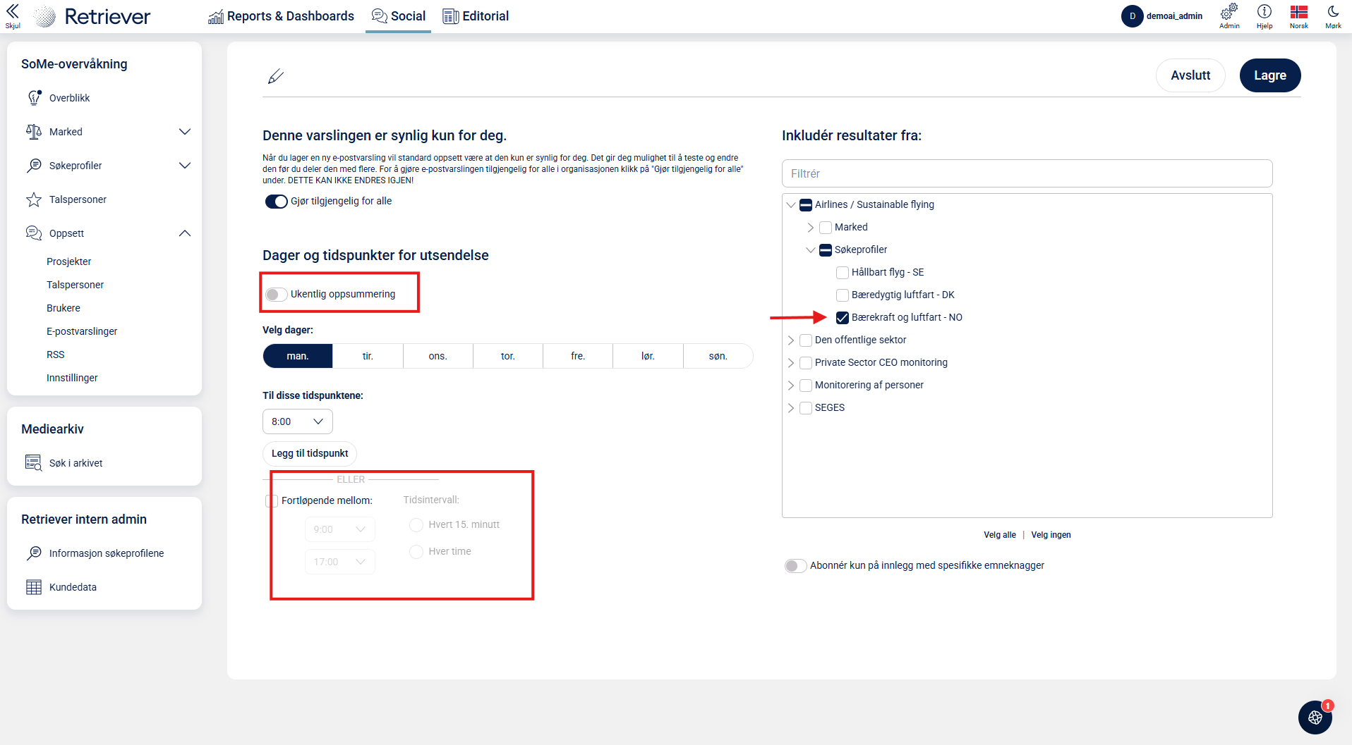 Under Dager og tidspunkt for utsendelse kan du også velge å overvåke spesifikke søk og prosjekter/ grupper.