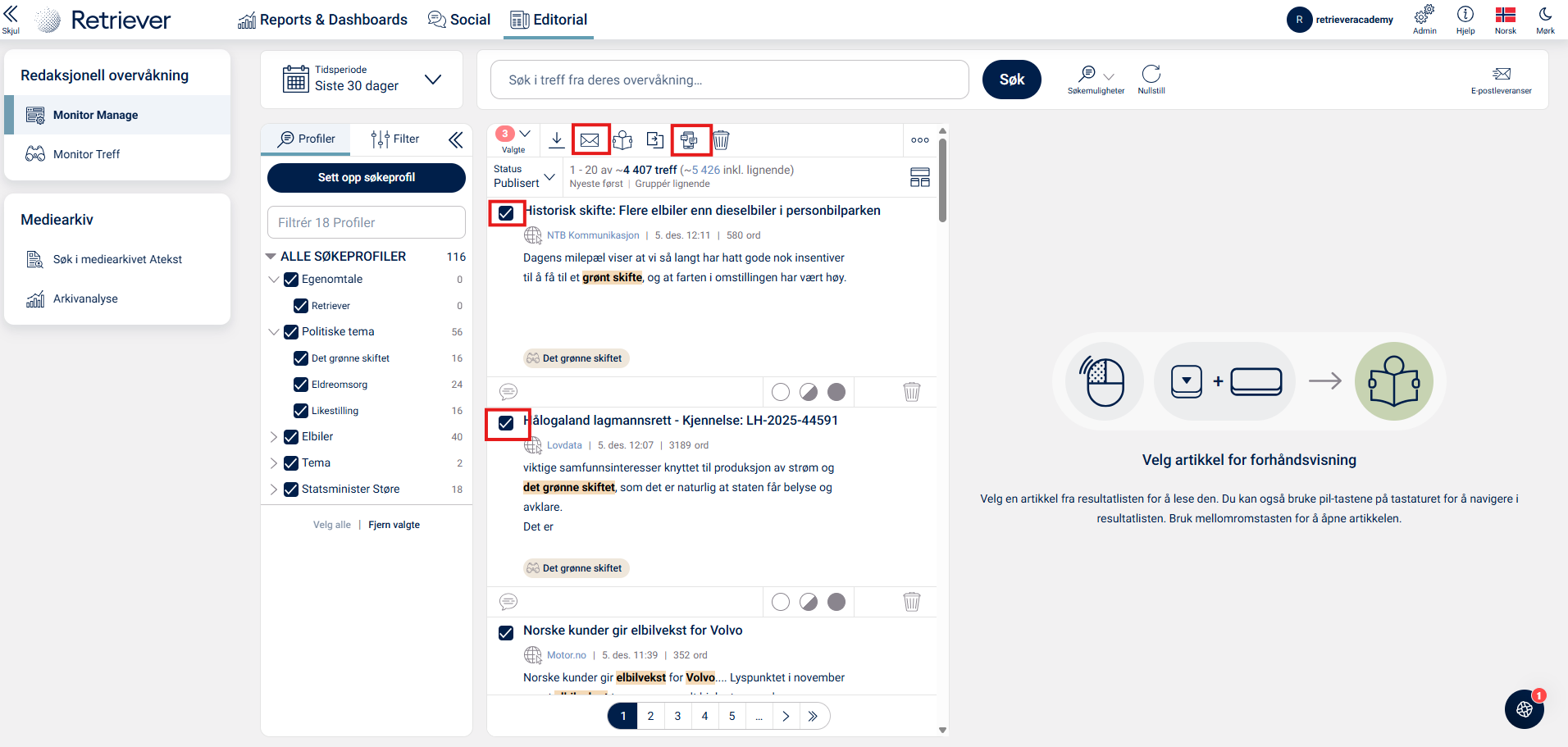 Du kan dele artikler med kollegaer i organisasjonen din ved å huke av for de artiklene du ønsker å dele, huk av i den lille boksen til venstre for overskriften på hvert treff.