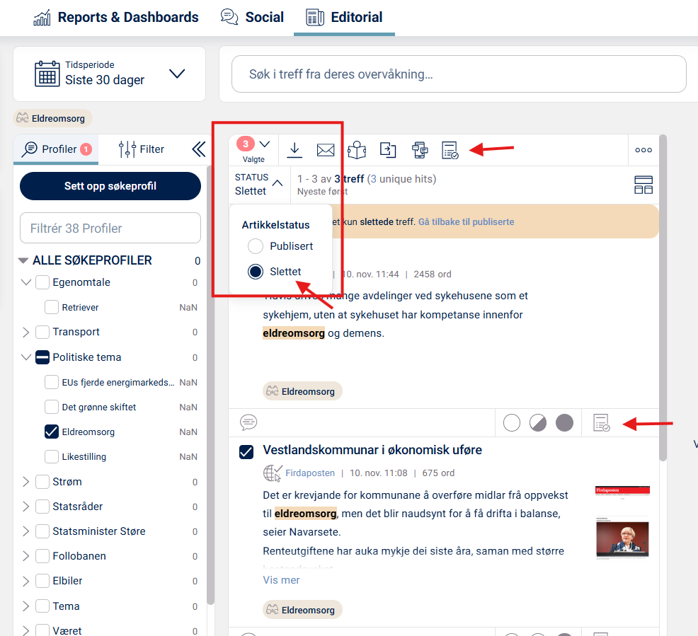 Om du har slettet en artikkel, kan du hente artikkelen tilbake om du har en editor brukertilgang. Trykk på Status nedenfor verktøylinjen og velg Slettet. Dette vil vise artiklene som har blitt slettet de siste 7 dagene. Da skal det stå Publiser i stedet for Slettet i verktøylinjen. Trykk på Publiser-ikonet i verktøylinjen og artikkelen vil da bli flyttet fra Slettet tilbake til Publisert.