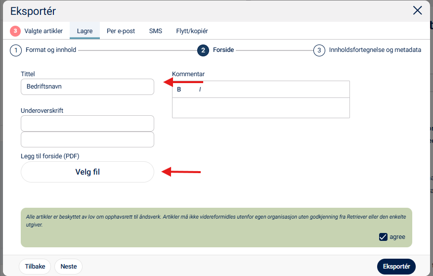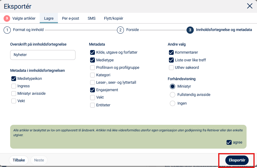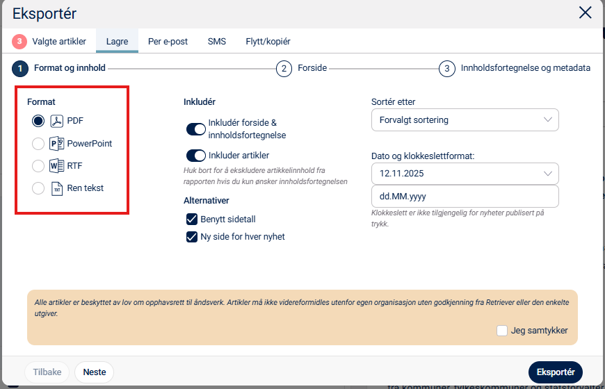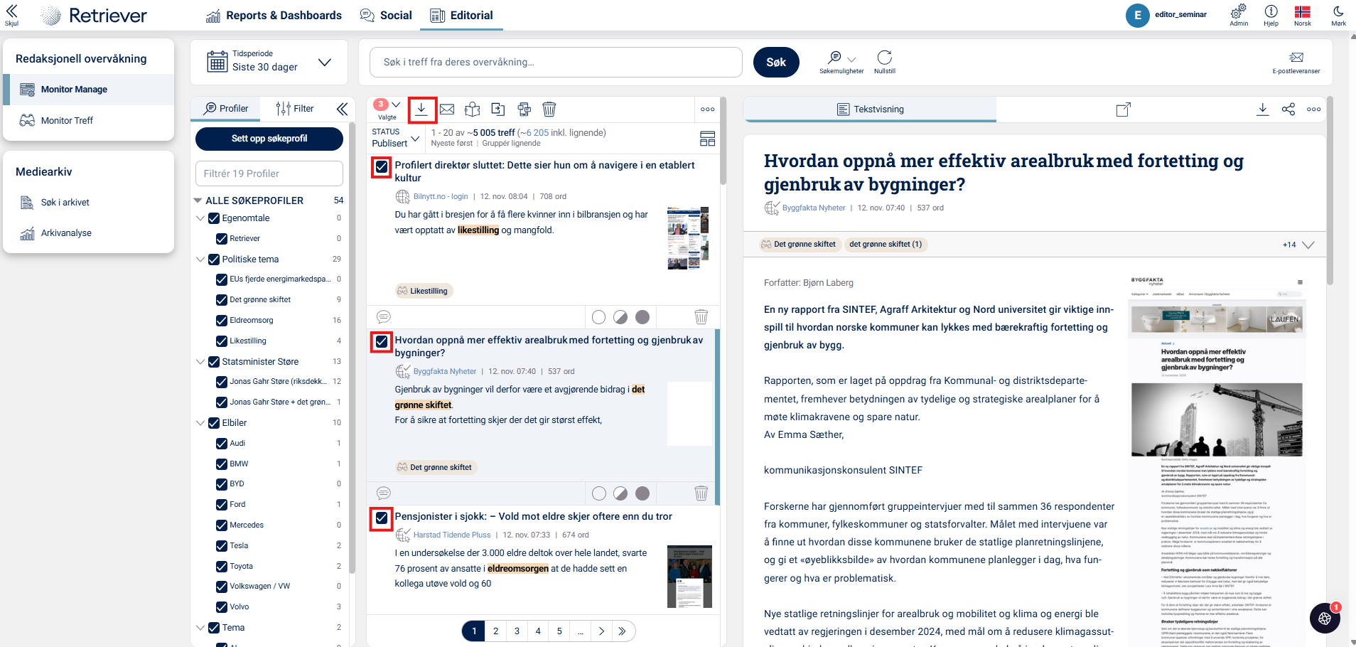 Du kan opprette en artikkelrapport ved å huke av for alle de treffene/ artiklene man ønsker skal inkluderes i rapporten. Velg artikler ved å huke av boksen til venstre ved hver artikkel. Når du har markert alle de aktuelle artiklene, klikk lagre i menyen over artiklene. Før du lagrer rapporten kan du også justere ulike innstillinger for å personalisere rapporten til ditt behov.