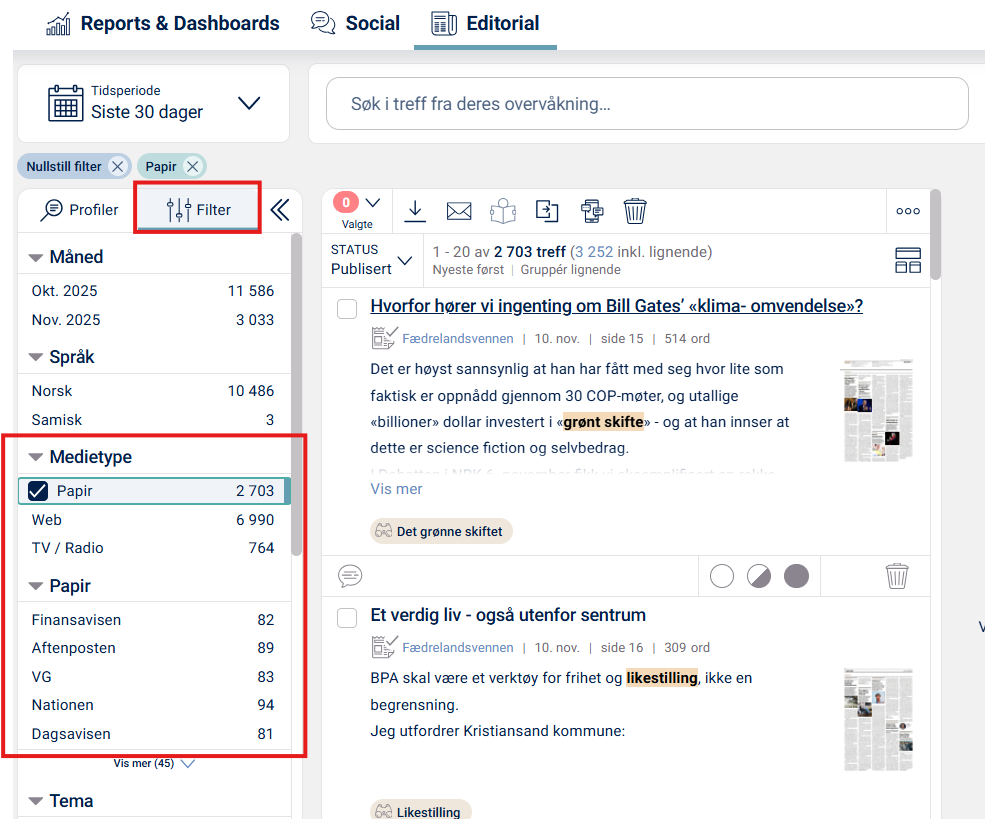 I Monitor Manage kan du filtrere artikler basert på hvilken kilde de er publisert i. Ved å klikke på Filter i den venstre kolonnen vil du se at kildene er gruppert etter TV/radio-, nett- og papirkilder. Klikk på medietypen du ønsker deg og velg deretter kilder fra listen under, for eksempel papir.