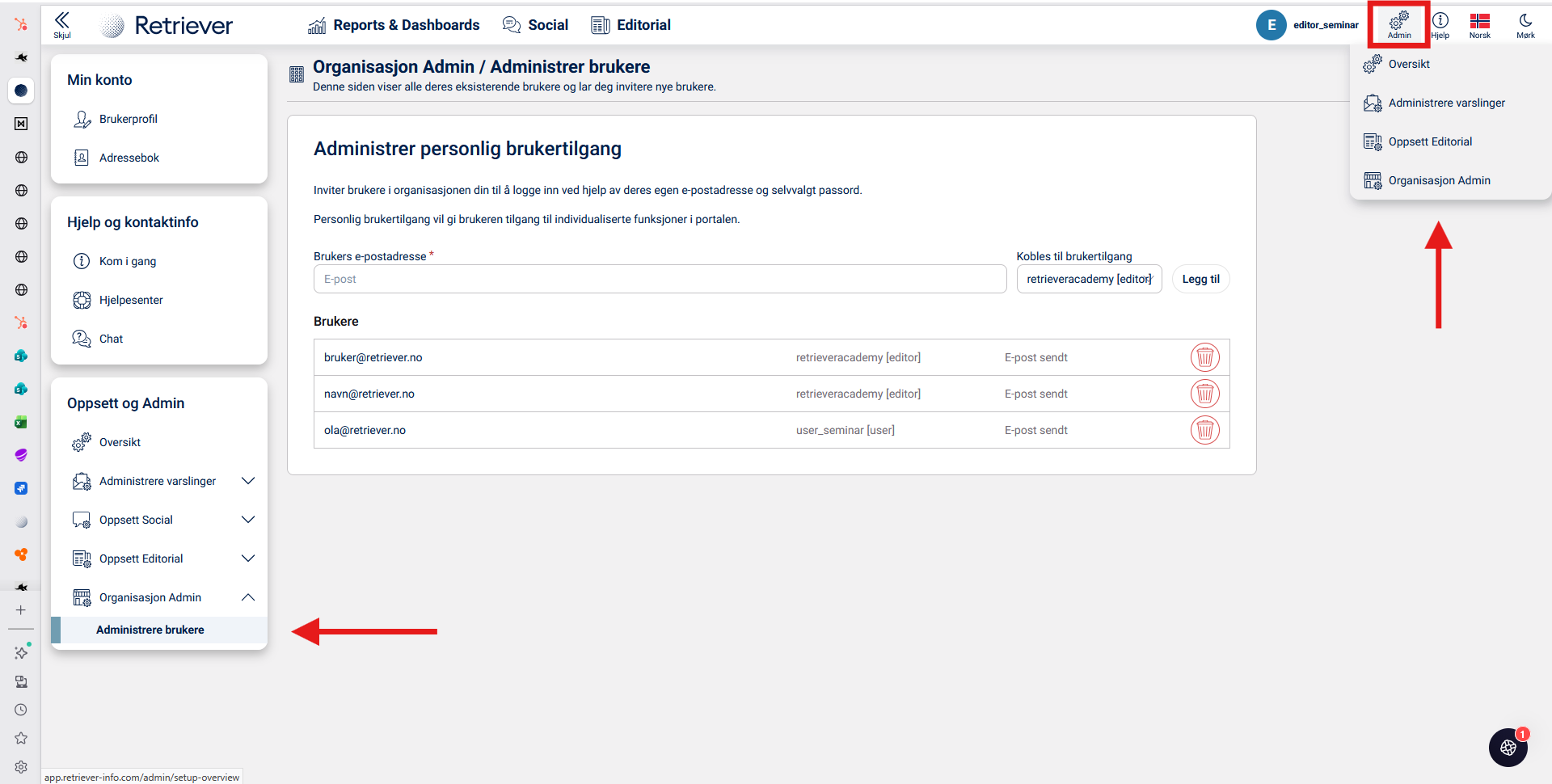 Har du en editor-tilgang har du mulighet til å legge til, slette og redigere brukere i portalen. Dette gjør du ved å trykke på admin i menyen øverst til høyre og velge "Organisasjon Admin":
