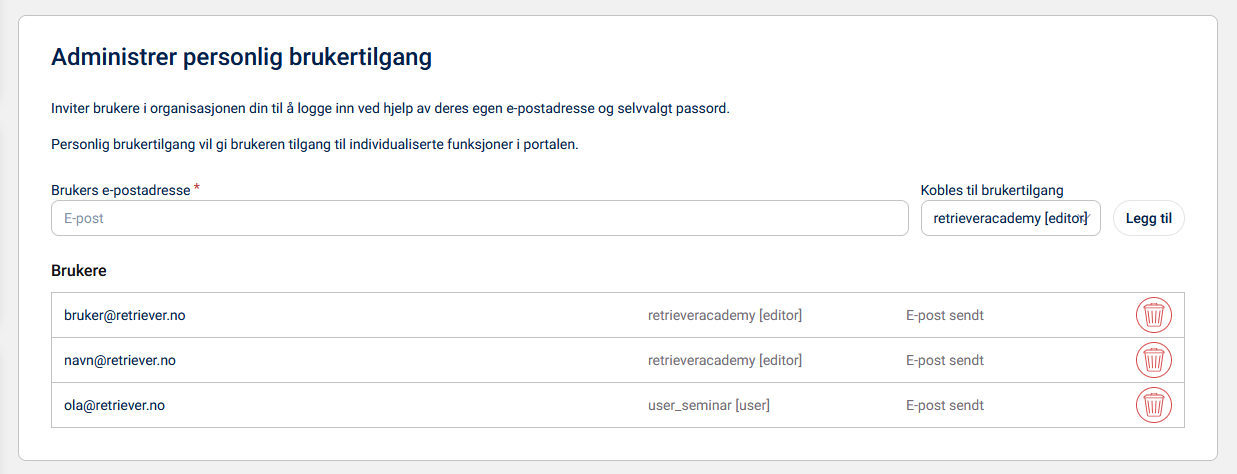 Om du ikke har tilgang til å administrere brukere, kontakt oss på supportnorge@retriever.no, eller bruk vår chat-funksjon inne i portalen.