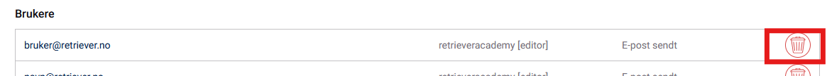 Slette brukere: finn brukeren du ønsker å slette og klikk på den røde søppelbøtten ved siden av vedkommendes navn: