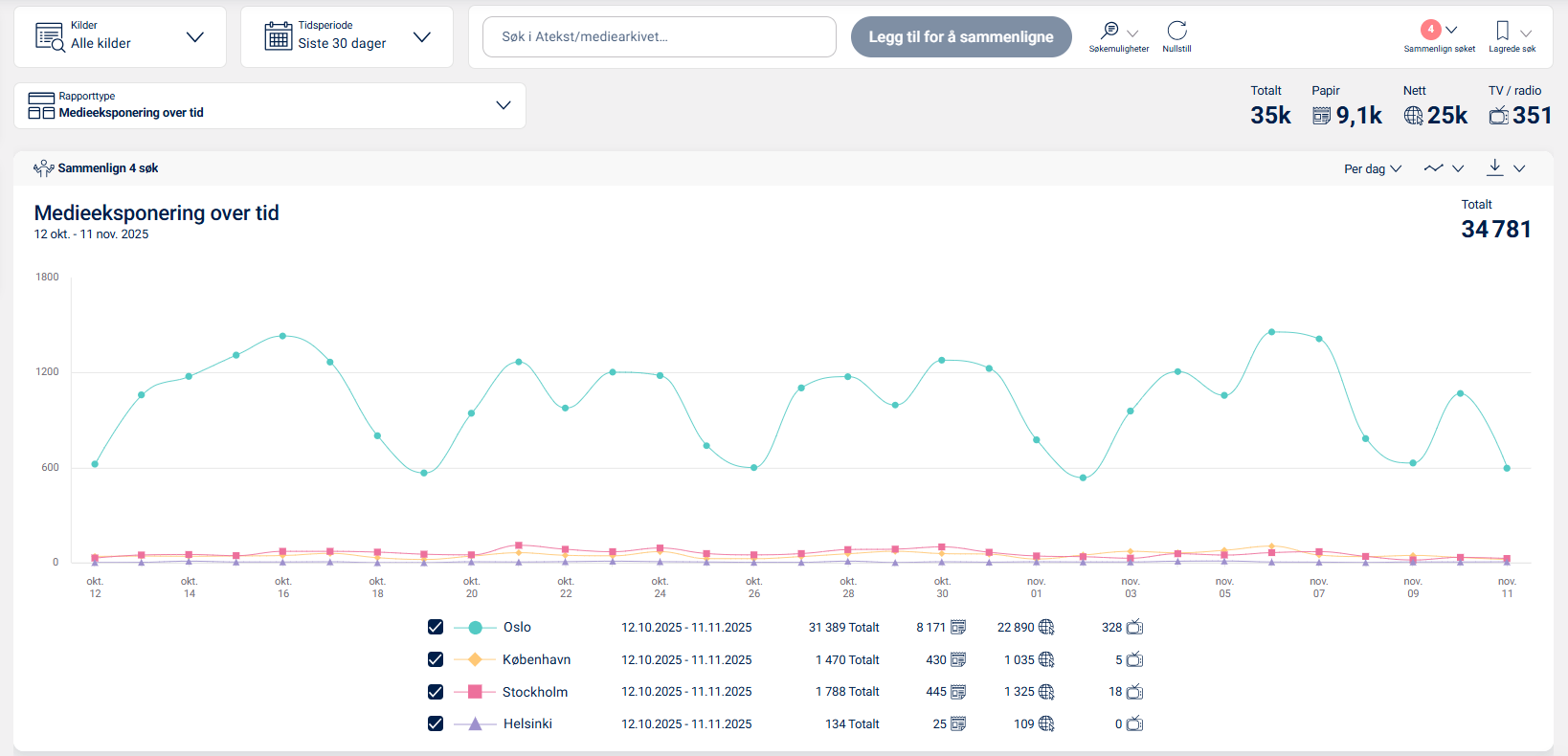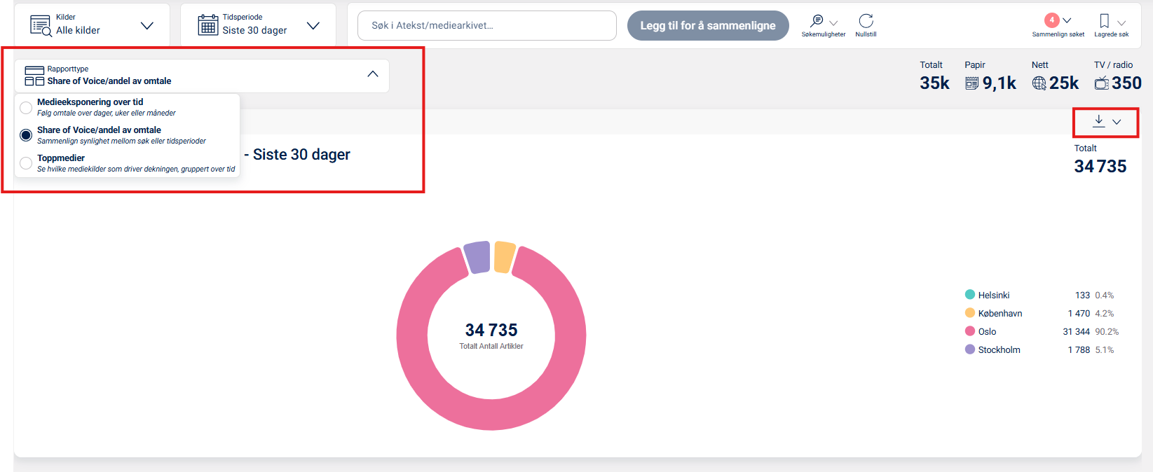 Se også ulike rapporter i form av Over tid, toppmedier eller Share of Voice