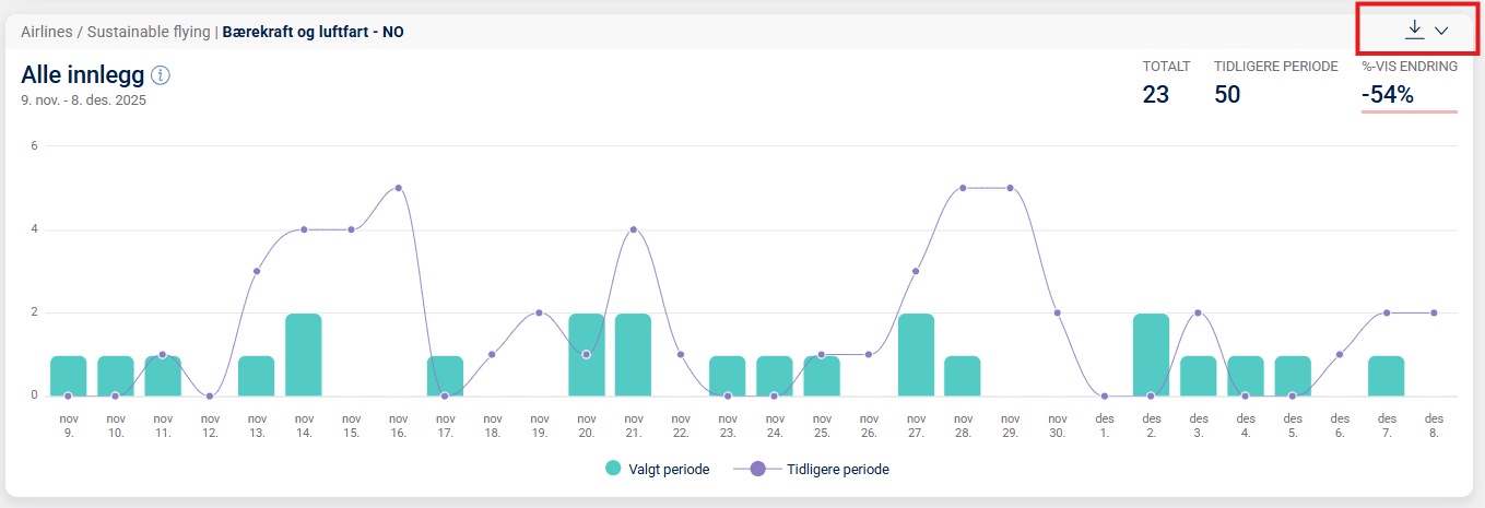 Ja, det er mulig å laste ned data og statistikk fra Listen. Oppe til høyre ved et diagram finner du en liten pil. Ved å klikke på den kan du velge hvilket format du ønsker å laste ned data i.