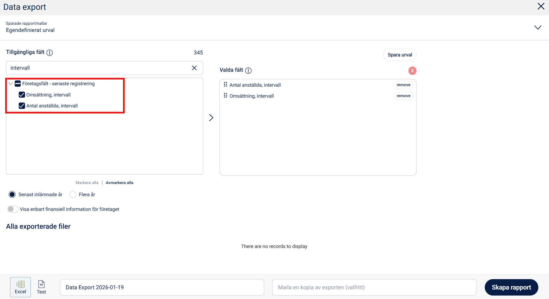 Exporten av enskilda firmor skiljer sig lite från export av exempelvis aktiebolag eftersom datan bygger på en omsättningsintervall från SCB, istället för årsredovisningar som för aktiebolag. Det innebär att följande fält behöver väljas om du vill exportera data om enskilda firmor: