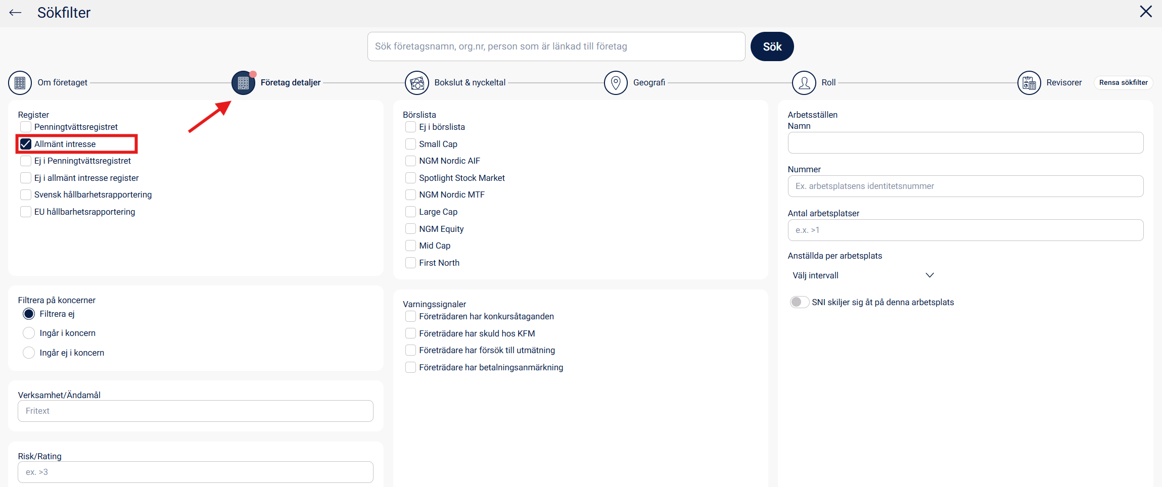 Du kan söka efter företag av allmänt intresse genom att ställa in sökfiltret enligt bilden nedan: