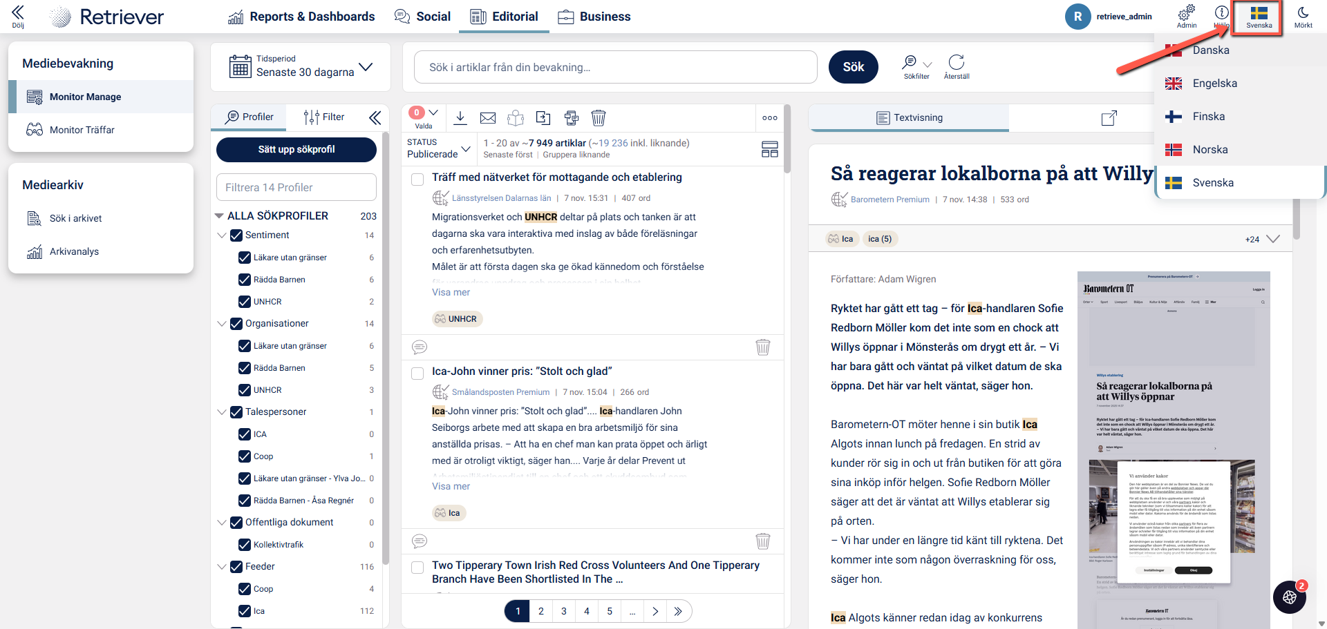 Du kan ändra språk i plattformen genom att klicka på flaggan uppe till höger i toppmenyn, se här:
