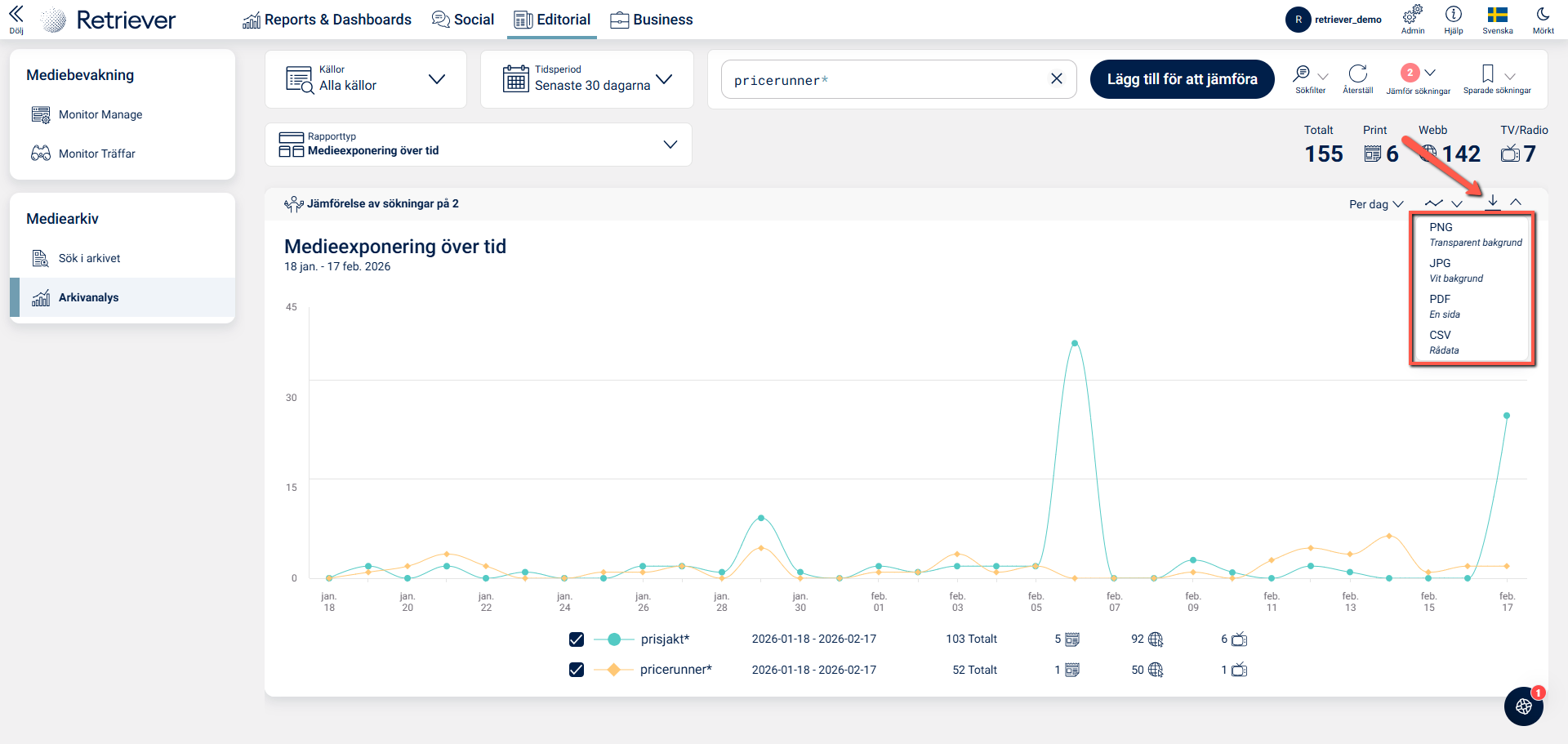 När du är klar med din analys kan du välja att spara ner ditt diagram som PNG, JPG, PDF eller CSV genom att trycka på "spara" uppe i högra hörnet.