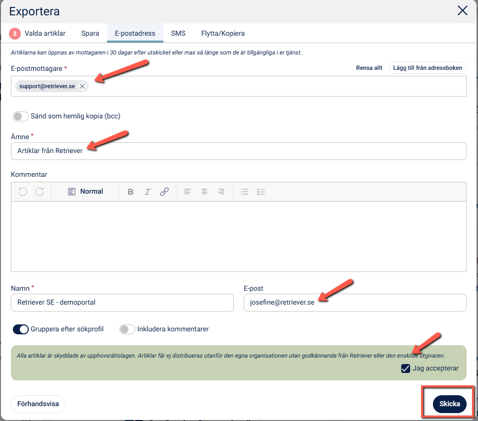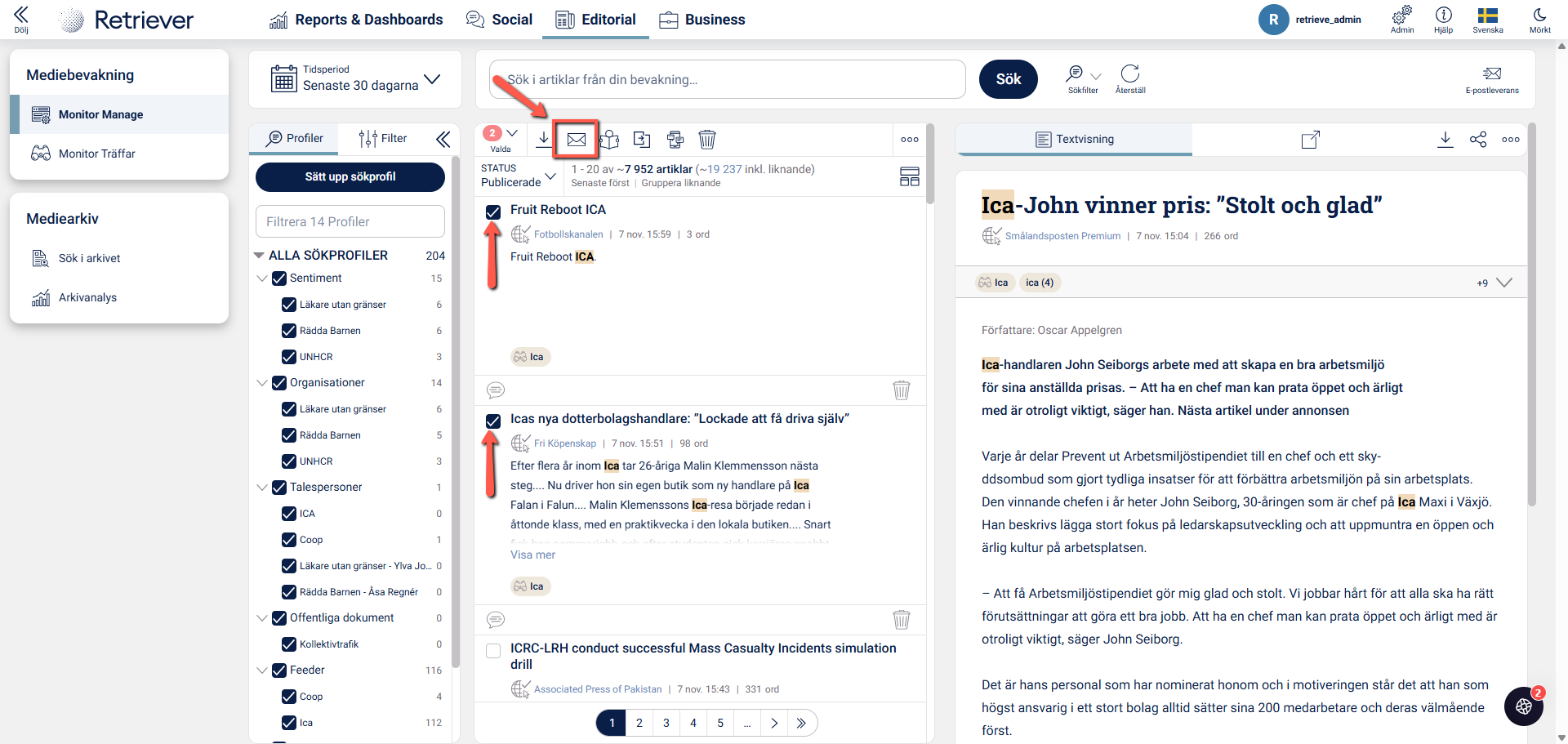 Observera att det är enbart tillåtet att dela artiklar och material från Retriever med andra inom den egna organisationen. Det är inte tillåtet att dela artiklar till tredjepart utan tillstånd.