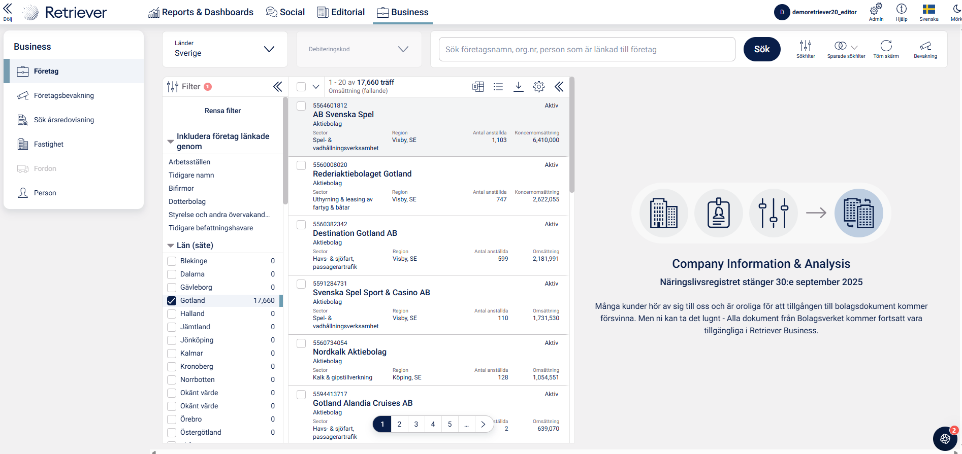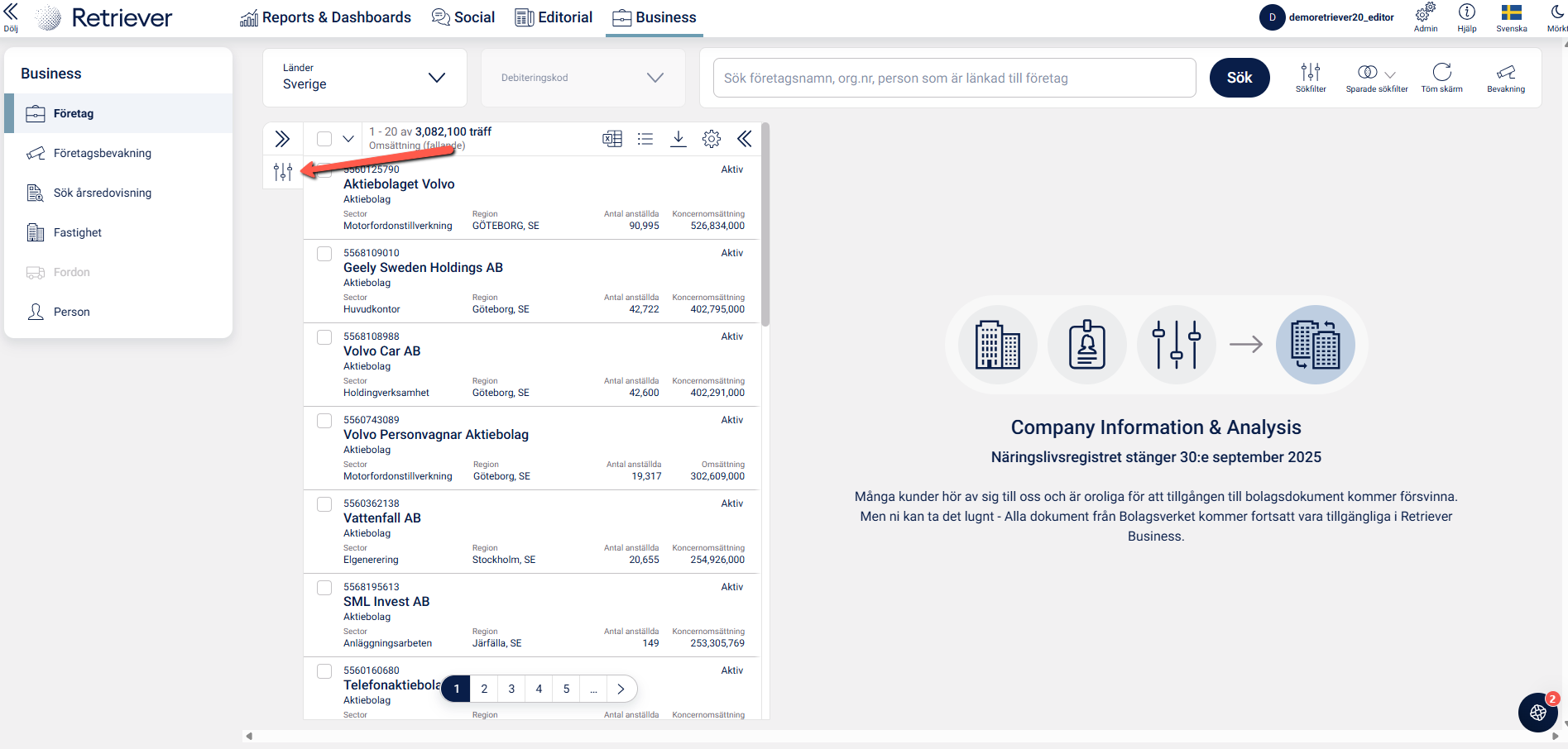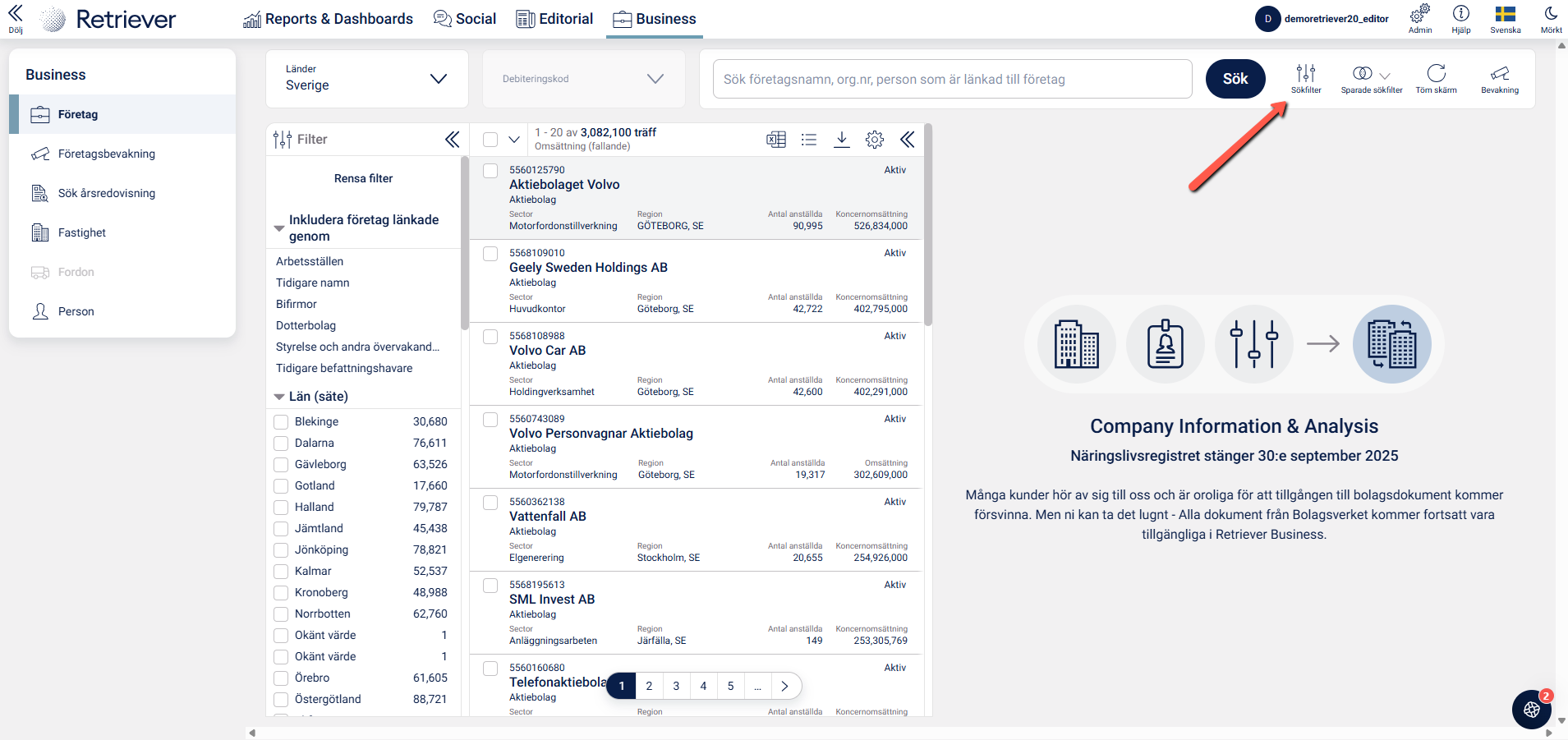 Hur du söker och filtrerar i Retriever Business.