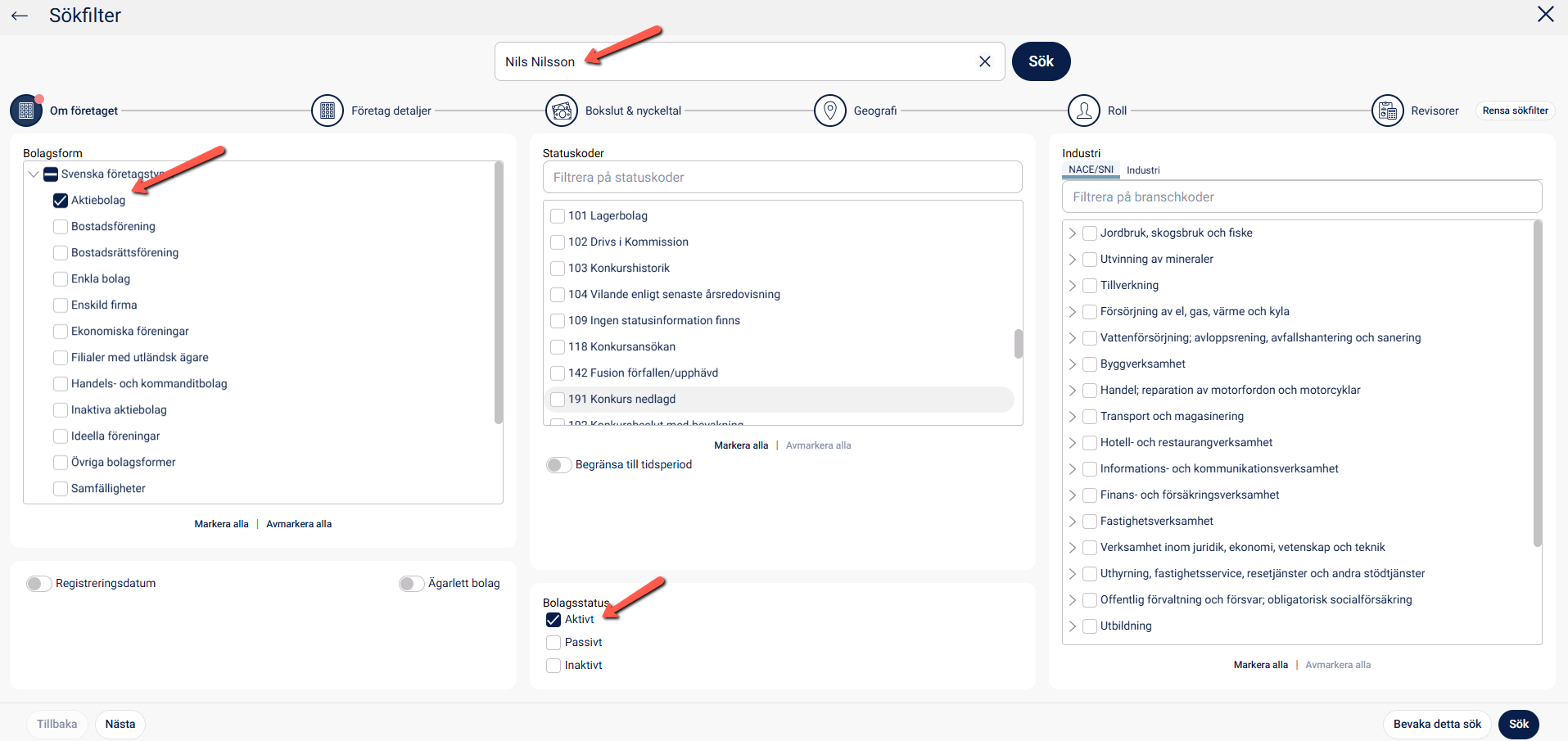 I sökfältet kan du ange företagsnamn eller organisationsnummer, men även personnummer till befattningshavare.