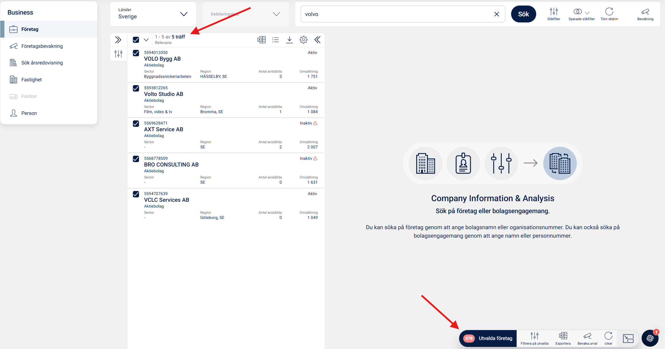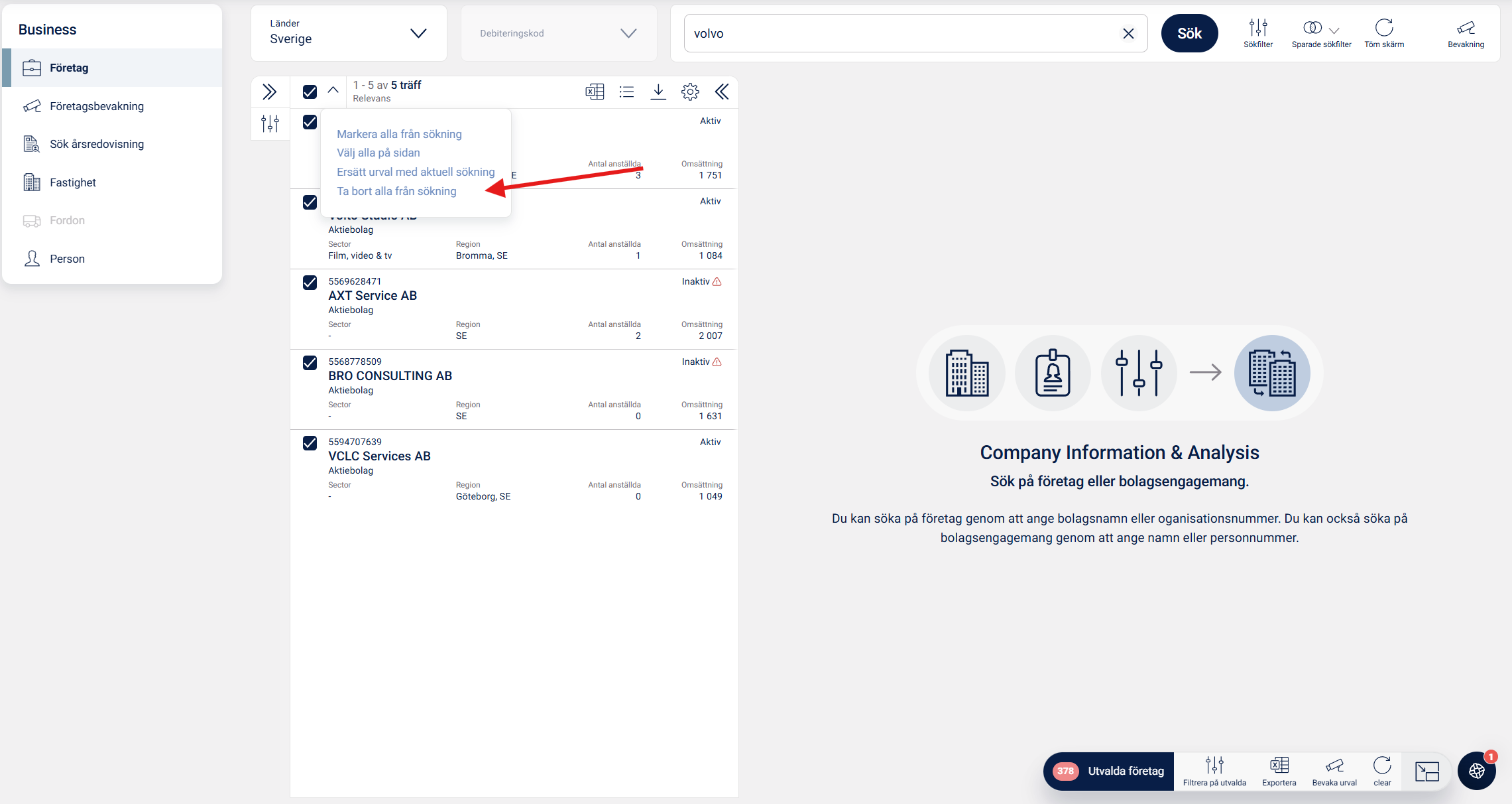 I ovanstående bild kan du se att de 378 träffarna från den ursprungliga sökningen ligger kvar som markerade, men du har också fått fem nya träffar som uppfyller den ursprungliga filtreringen, men också omsätter 1 000 000 - 5 000 000 kronor. När du nu ska exkludera dessa sex träffar från det totala sökresultatet väljer du ta bort alla från sökning, och har då exkluderat dessa bolag från den ursprungliga sökningen.
