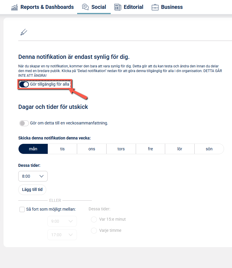 Glöm inte att bocka i Gör tillgänglig för alla, för att aviseringen ska bli tillgänglig för övriga användare och prenumeranter.