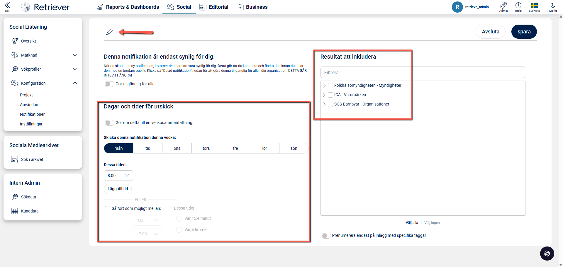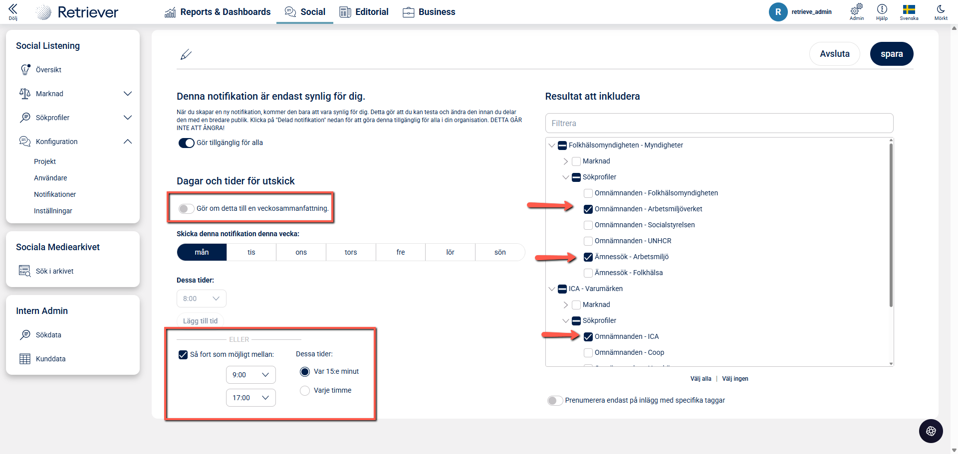 Under Resultat att inkludera kan du också välja att bevaka olika delar av projekt t.ex. en specifik sökning, eller en specifik marknad.