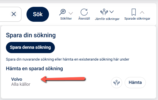 Tänk på att det endast är sökorden som sparas; källurval och tidsperiod sparas inte i sökningen.
