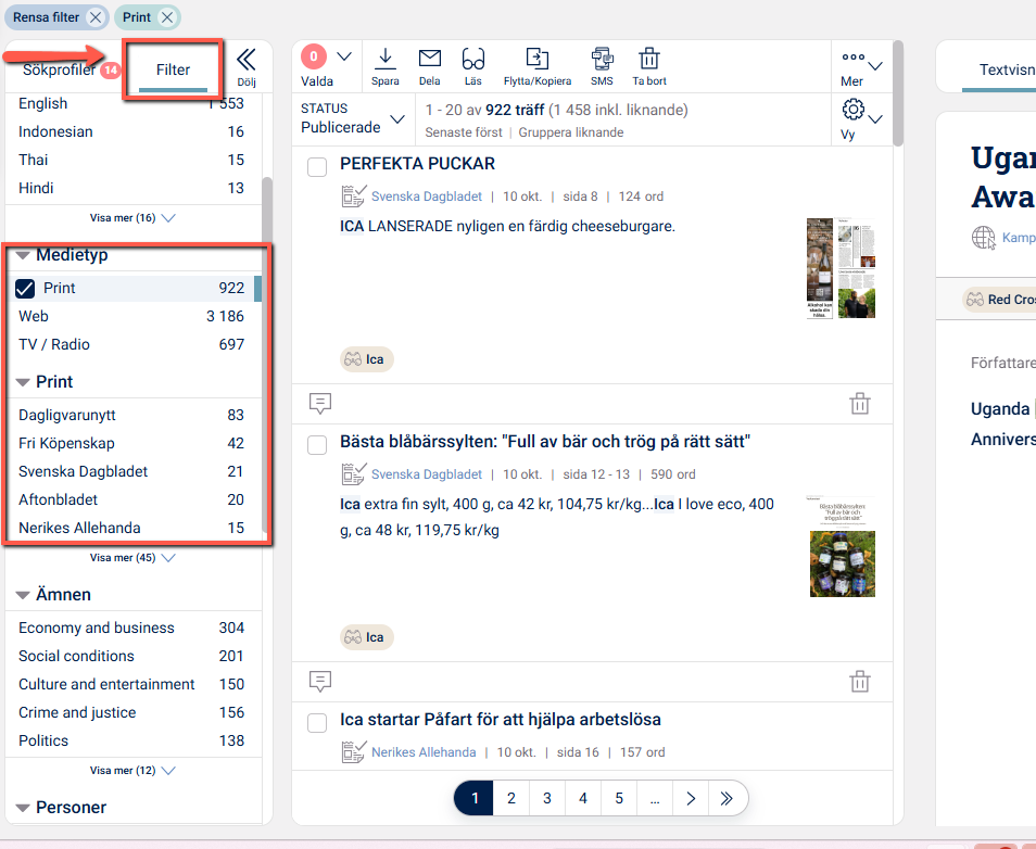 I Monitor kan du filtrera artiklar baserat på vilken källa de publicerats i. I vänsterspalten i Monitor ser du att källorna är grupperade efter webbkällor, tryckt press och TV/radio.
